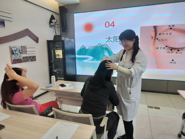 中医师通过生动有趣的中医养生小故事,深入浅出地传递养生理念,引发组员共鸣。随后,医生结合理论与实操,为大家讲解并带领体验“身体上的养生开关”,指导长者在日常生活中通过穴位按摩进行自我保健。课堂内容实用易操作,现场互动积极,氛围热烈。