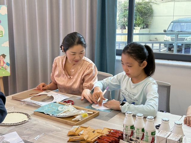 随后,活动进入了手工制作环节。在手工老师的指导下,家长与孩子们齐心协力,共同动手制作精美的珍珠绒面扇子。从构图设计、材料搭配到精心粘贴,每一步都充满了亲子间的亲密合作。一件件独一无二、充满创意的手工作品在亲子协作中完美呈现,现场气氛暖意融融。