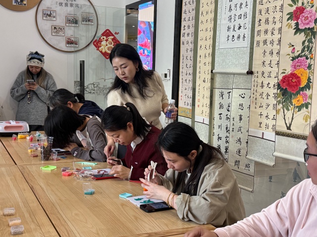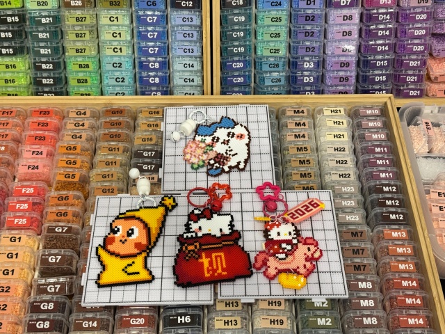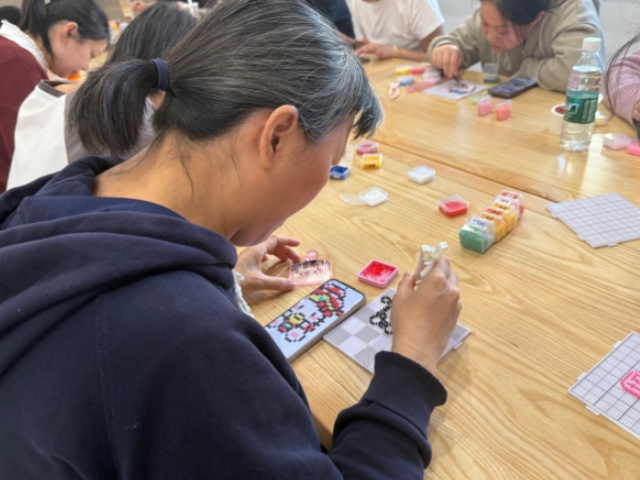 活动现场,色彩斑斓的拼豆材料整齐摆放。在专业手工艺老师的指导下,大家首先挑选心仪的图案——可爱的卡通形象、新年主题样式或寓意吉祥的祝福字样。随后,参与者细心对照色号,挑选对应颜色的拼豆颗粒,逐步学习拼搭技巧,沉浸于创作之中