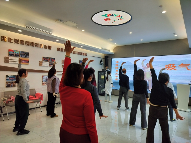 除了食疗与理疗的静态知识积累,活动更注重“动静结合”的养生理念,专门设置传统养生功法八段锦学习环节。八段锦医师先介绍功法的起源与对中老年的调理益处,随后逐步分解教学“左右开弓似射雕”“调理脾胃须单举”等核心招式。考虑到长者学习节奏,活动特别设置“一帮一”练习环节,组员们互相观察指导、互帮互助,医师则巡场逐一纠正动作细节。集体练习与放松后,大家纷纷分享身体感受,“每日三式”的小作业更让养生习惯从课堂延伸到日常生活。