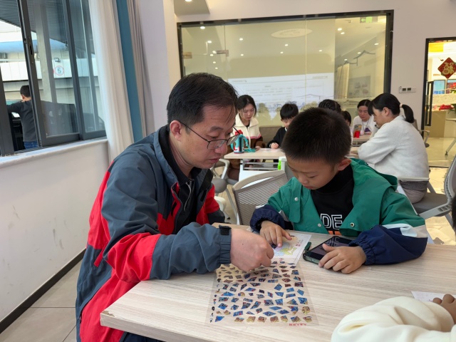 “认识好朋友”游戏迅速点燃现场气氛,孩子们主动自我介绍、握手微笑,自然融入集体。共读绘本《长着空洞的男孩》后,老师以提问引导讨论,帮助孩子学习倾听与表达。在文物修复手工环节,亲子共同拼接碎片、精准定位,在协作中体会团队力量,也懂得了礼貌分享与相互理解的重要性。
