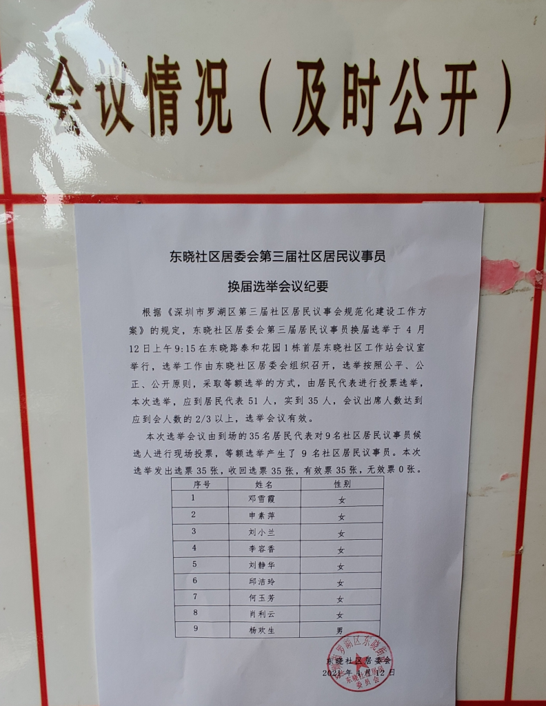 根据《深圳市罗湖区第三届社区居民议事会规范化建设工作方案》的规定,东晓社区居委会第三届居民议事员换届选举于4月12日上午9:15在东晓路泰和花园1栋首层东晓社区工作站会议室举行,选举工作由东晓社区居委会组织召开,选举按照公平、公正、公开原则,采取等额选举的方式,由居民代表进行投票选举,本次选举,应到居民代表51人,实到35人,会议出席人数达到应到会人数的2/3以上,选举会议有效。