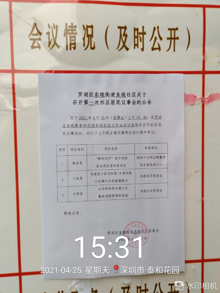 定于2021年4月30日(星期五)上午10:00,在罗湖区东晓路泰和花园东晓社区工作站会议室组织召开社区居民议事会议,对以下3个民生微实事项目进行集中审议: