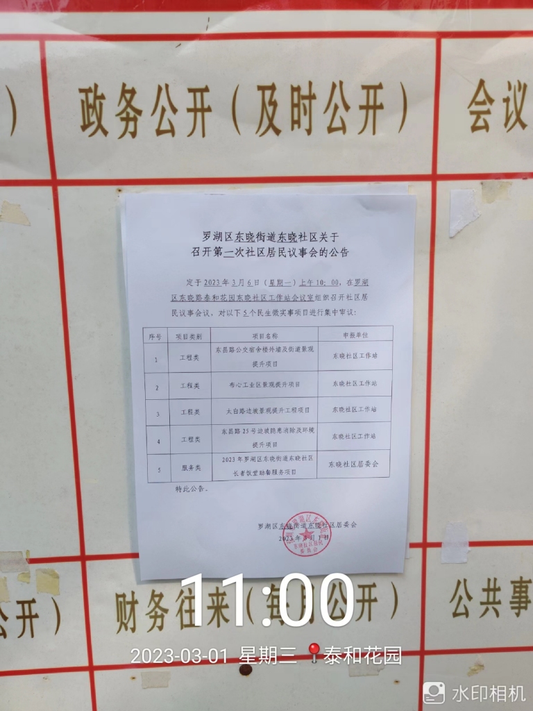 定于2023年3月6日(星期一)上午10:00,在罗湖区东晓路泰和花园东晓社区工作站会议室组织召开社区居民议事会议,对以下5个民生微实事项目进行集中审议:
