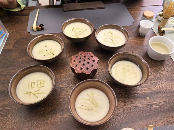 点茶技艺作为中国古代茶文化的重要组成部分,蕴含着丰富的历史底蕴和文化内涵。选水、炙茶、碾磨、罗筛、调膏、击拂……在活动中,老师通过细致入微地演示宋代点茶技艺的步骤,让现场居民近距离地感受到点茶的精妙与雅致。随后,在老师的悉心指导下,大家亲手体验点茶技艺中的“击拂”。经过反复多次注汤击拂,茶汤变得温润生辉、茶沫如雪。完成点茶后,大家还尝试用茶笔蘸取深色茶粉,在茶沫上书画,体验茶百戏的乐趣。