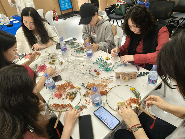 粘花扇作为非遗项目,承载着深厚的文化底蕴。学习扇面粘花,不仅是对传统技艺的传承,更是展现自我创造力的绝佳方式。活动开始,手工老师粘花扇的文化历史开始进行介绍,接着,教大家看扇面布局,及构思如何使用各自手上已有的干花材料:花朵到小草的位置、各种色彩搭配、大小层叠的美感等等。经过1个半小时精心制作,30柄承载着传统美学的团扇渐次成型。“没想到传统工艺也能与现代生活结合得这么美,回家要和孩子一起分享下。”参与者李女士展示着作品说道。