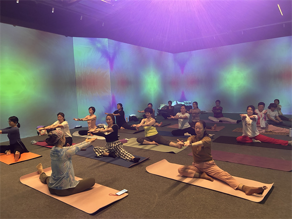 活动现场,社区特别邀请辖区瑜伽达人莫小明老师,结合金啤坊·城市光美术馆艺术空间独特的工业美学与艺术氛围,设计了 “呼吸唤醒 — 体式疗愈 — 冥想升华” 三阶段课程。长者们首先通过 “完全式呼吸法” 开启身心感知。双手置于胸腔与腹部,感受气息如溪水般在体内流动,有效激活横膈膜功能。随后进入体式练习环节,莫老师结合长者身体特点,设计了一套融合基础体式、平衡训练与呼吸调节的定制化动作。从“山式站立”到“树式平衡”,从“猫牛式”脊柱舒展到“仰卧蝴蝶式”深度放松,长者们跟随节奏在艺术装置环绕的空间中缓缓伸展,逐步打开肩颈、腰背等易僵部位。