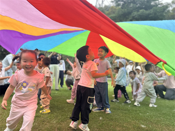 活动伊始,金威国际公学的老师带领亲子家庭手牵手围成大圆圈,开展降落伞游戏。家长们高举彩色“降落伞”,通过站立、蹲下等动作变换,配合口令引导孩子做出不同反应。简单的游戏设计,让孩子们沉浸其中,现场洋溢着欢快的笑声。
