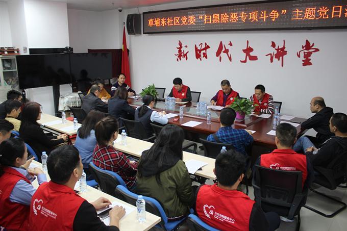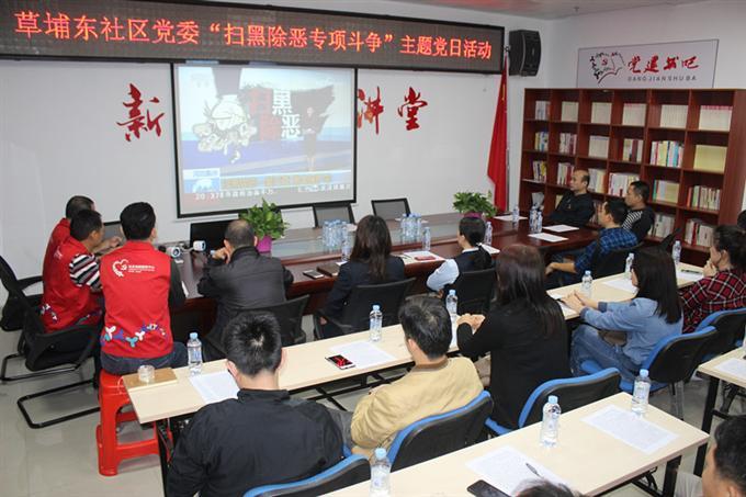 为落实区委组织部《关于开展扫黑除恶主题党日活动的通知》文件要求,2018年12月26日下午,草埔东社区党委在社区新时代大讲堂开展“扫黑除恶专项斗争”主题党日活动。本次主题党日活动目的在于深入贯彻落实党的十九大部署和中共中央 国务院发出的《关于开展扫黑除恶专项斗争的通知》要求。活动内容包括:观看有关扫黑除恶专项斗争典型案件警示教育片、学习习近平总书记关于开展扫黑除恶专项斗争重要指示精神及《扫黑除恶专项斗争应知应会基础知识》等。社区党委会、居委会全体委员和各党支部委员、党员代表共24人参与活动。