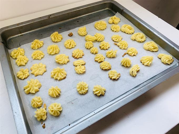 工作坊以热身游戏开场,活跃了现场气氛,接下来进入烘焙环节,本次工作坊前期招募了3位爱好烘焙制作的义工提前学习曲奇饼干的制作方法,工作坊开展期间由这3位义工在小组中协助,参加者以小组为单位,大家互相讨论,相互配合,经过和面、造型、烘制后,一个个曲奇展现在大家面前。在等待出炉的过程中,大家一起玩“你说我猜”小游戏,共享欢乐时光。