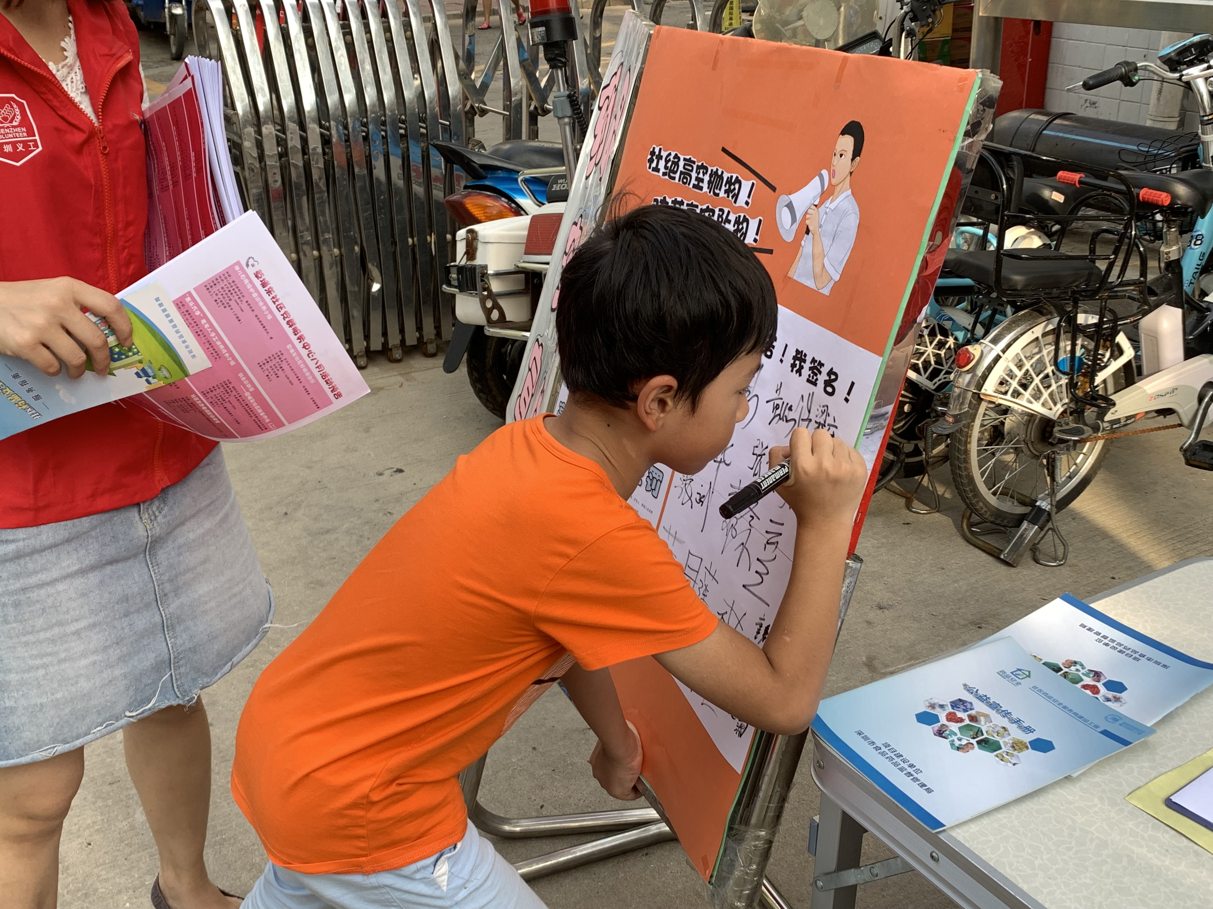 活动现场中,社工及义工以宣传台为主要阵地,通过发放宣传单和签名宣誓的形式,向来往的居民以及人群比较密集的地方发放宣传单,向居民讲述高空抛物的危害,提醒和告诫社区居民禁止高空抛物,倡导文明居家,共建和谐社区。活动从一开始就得到居民们的积极响应,大家纷纷在杜绝高空抛物的宣传栏上签名,并表示不仅自己做到不高空抛物,更要监督身边的人,一起宣传,大家共同维护社区的安全。