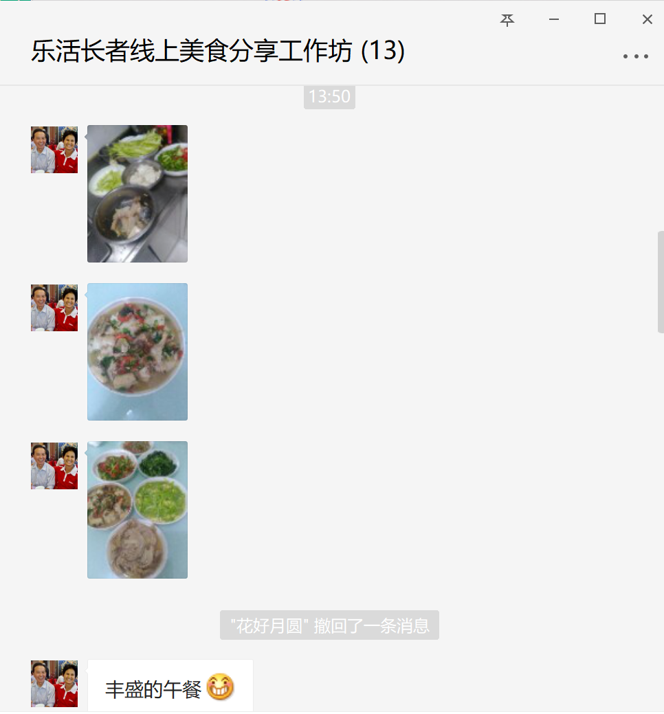 活动初始,社工带领大家通过线上群聊视频相互认识,了解大家来自哪里及家乡的美食,然后社工进行了做菜技巧问答小游戏,使工作坊的氛围变得融洽和轻松。社工进而介绍本次工作坊的主题---美食分享。社工邀请参加者轮流分享美食的制作过程或心得感受,大家分享的菜式有“辣椒炒虾”“剁椒鱼头”“洋葱炒肉”“红烧鱼”“酿豆腐”等等,在本次线上视频结束后,参加者们纷纷在微信群里发出做好的美食照片,大家在群里互相称赞,共同讨论美食,聊得不亦乐乎。