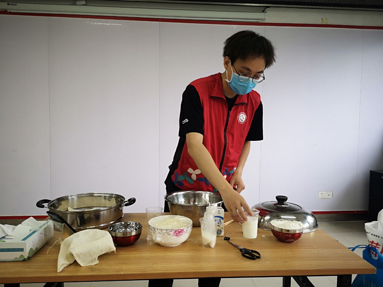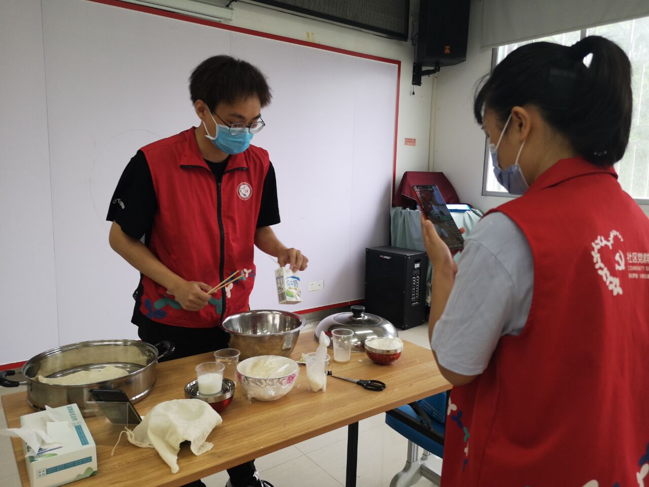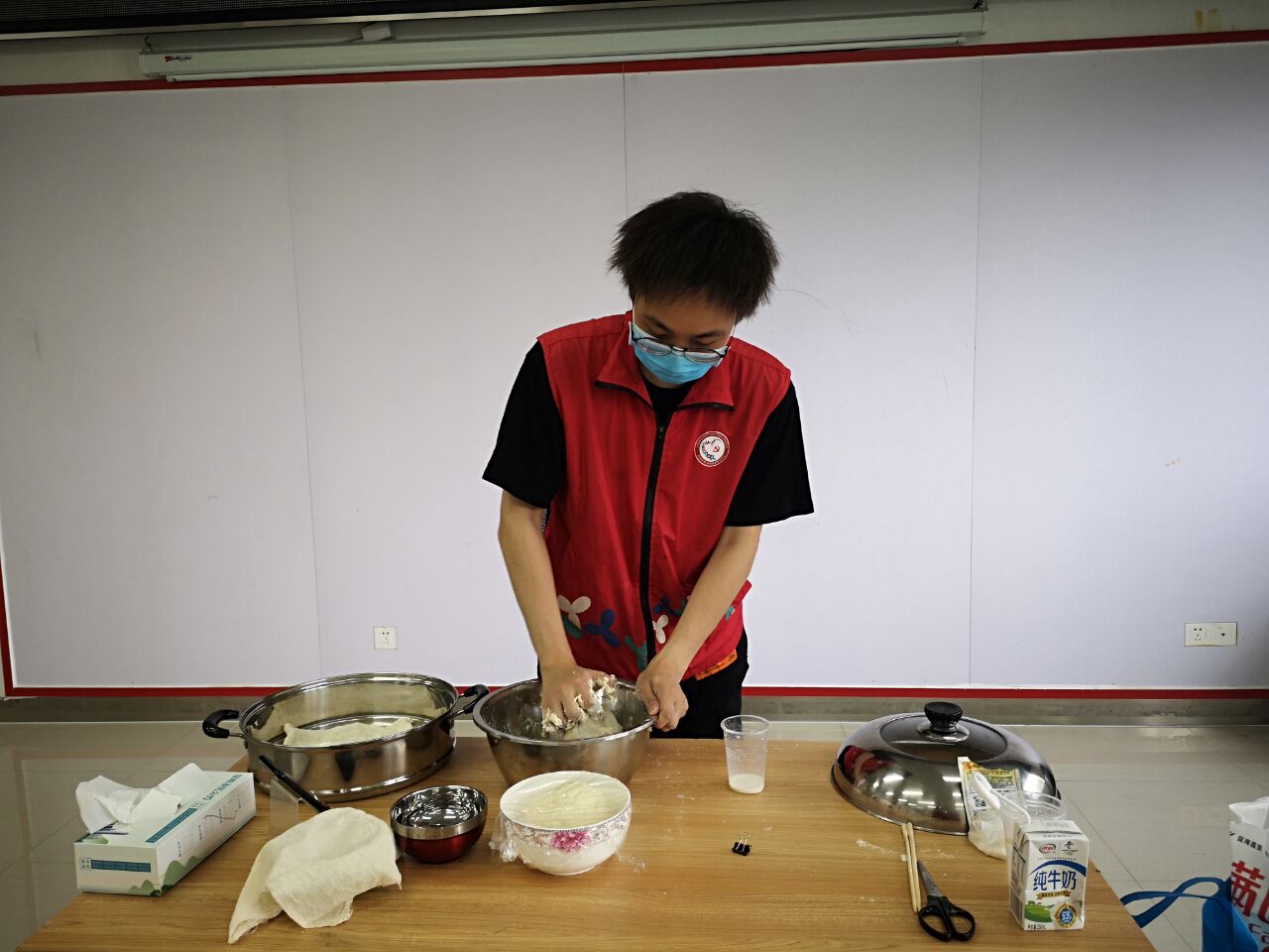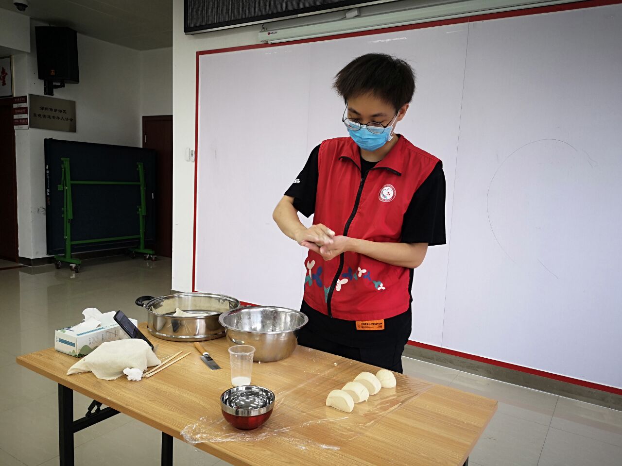 开展前,参加者线下无接触领取奶香馒头的材料。工作坊开展当天,社工开始线上直播将奶香馒头的制作材料及过程给大家讲解和演示。社工先将酵母粉用温水搅拌倒入牛奶中,然后将混合好的液体慢慢倒入面粉中,面粉揉至光滑的圆球,接着用保鲜膜封好等待发酵2小时,由于时间关系,社工将预先发酵好至两倍大小的面团拿出来,将面团继续揉搓,将面团内的气体排出,面团变得光滑后揉成长条状后用刀切成块状,最后将块状的面团放入蒸锅中继续等待二次发酵约半个小时,冷水下锅蒸15分钟左右即可,蒸好后等待几分钟再开锅。过程中与直播间的参加者一起进行弹幕互动,社工也耐心地回答大家的问题。直播结束后,参加者们纷纷开始尝试制作奶香馒头,做好后,大家把做好的馒头照片发到微信群里和大家一同分享,大家品尝了自己的作品后都觉得味道不错,获得了满满的成就感。