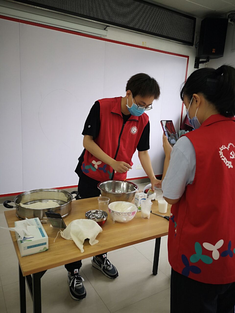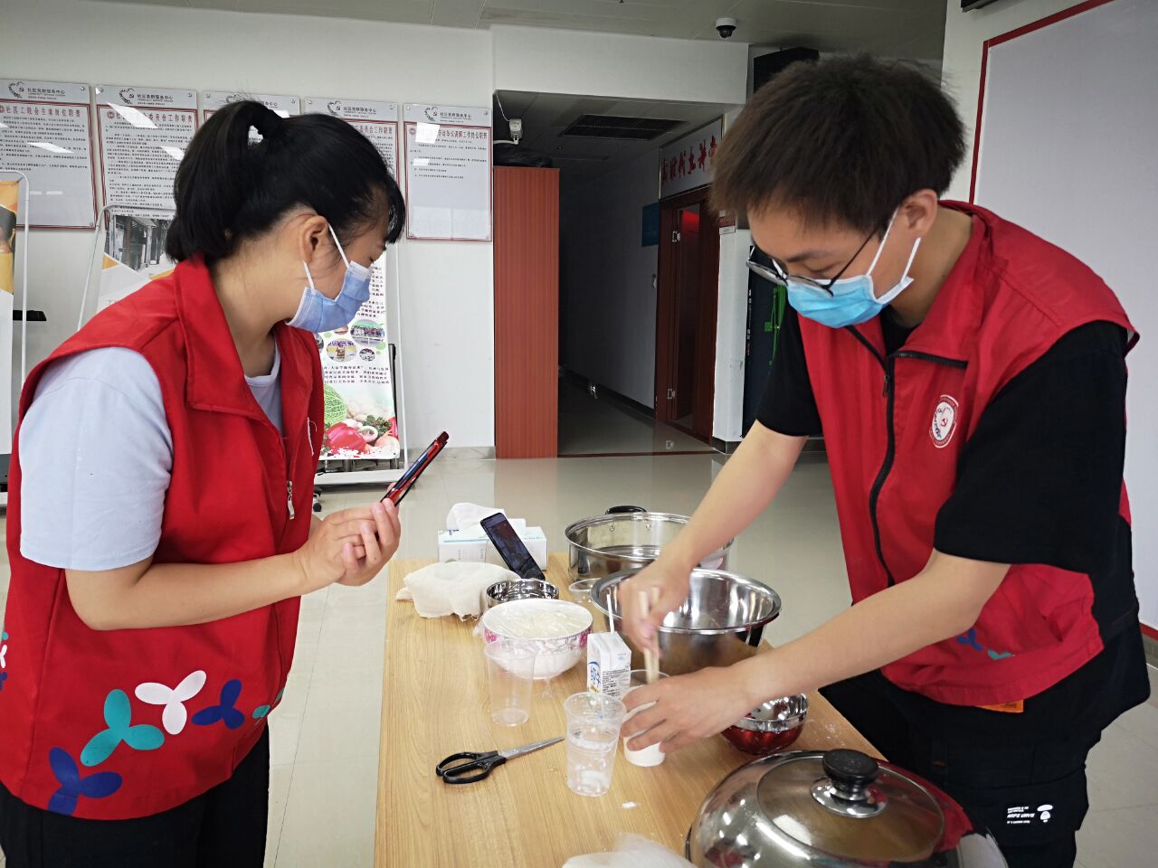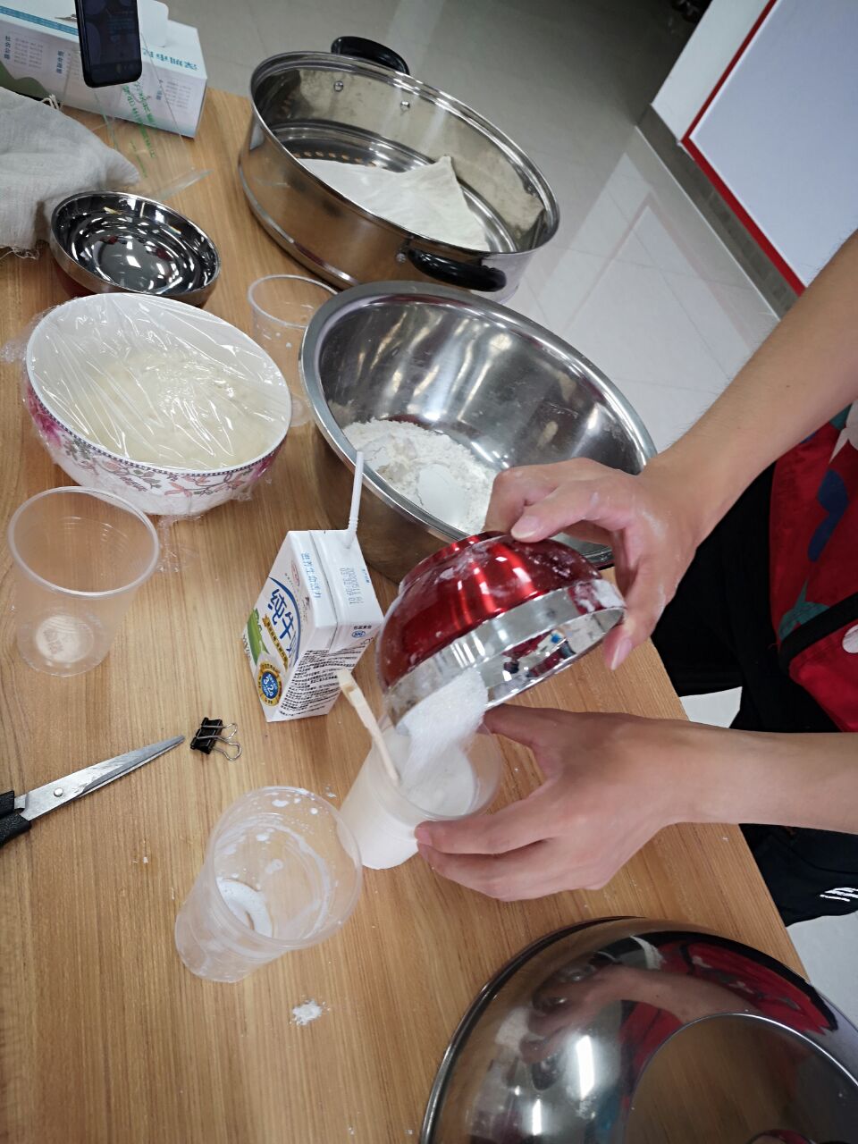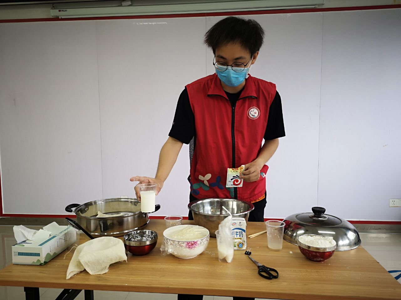 开展前,参加者线下无接触领取奶香馒头的材料。工作坊开展当天,社工开始线上直播将奶香馒头的制作材料及过程给大家讲解和演示。社工先将酵母粉用温水搅拌倒入牛奶中,然后将混合好的液体慢慢倒入面粉中,面粉揉至光滑的圆球,接着用保鲜膜封好等待发酵2小时,由于时间关系,社工将预先发酵好至两倍大小的面团拿出来,将面团继续揉搓,将面团内的气体排出,面团变得光滑后揉成长条状后用刀切成块状,最后将块状的面团放入蒸锅中继续等待二次发酵约半个小时,冷水下锅蒸15分钟左右即可,蒸好后等待几分钟再开锅。过程中与直播间的参加者一起进行弹幕互动,社工也耐心地回答大家的问题。直播结束后,参加者们纷纷开始尝试制作奶香馒头,做好后,大家把做好的馒头照片发到微信群里和大家一同分享,大家品尝了自己的作品后都觉得味道不错,获得了满满的成就感。