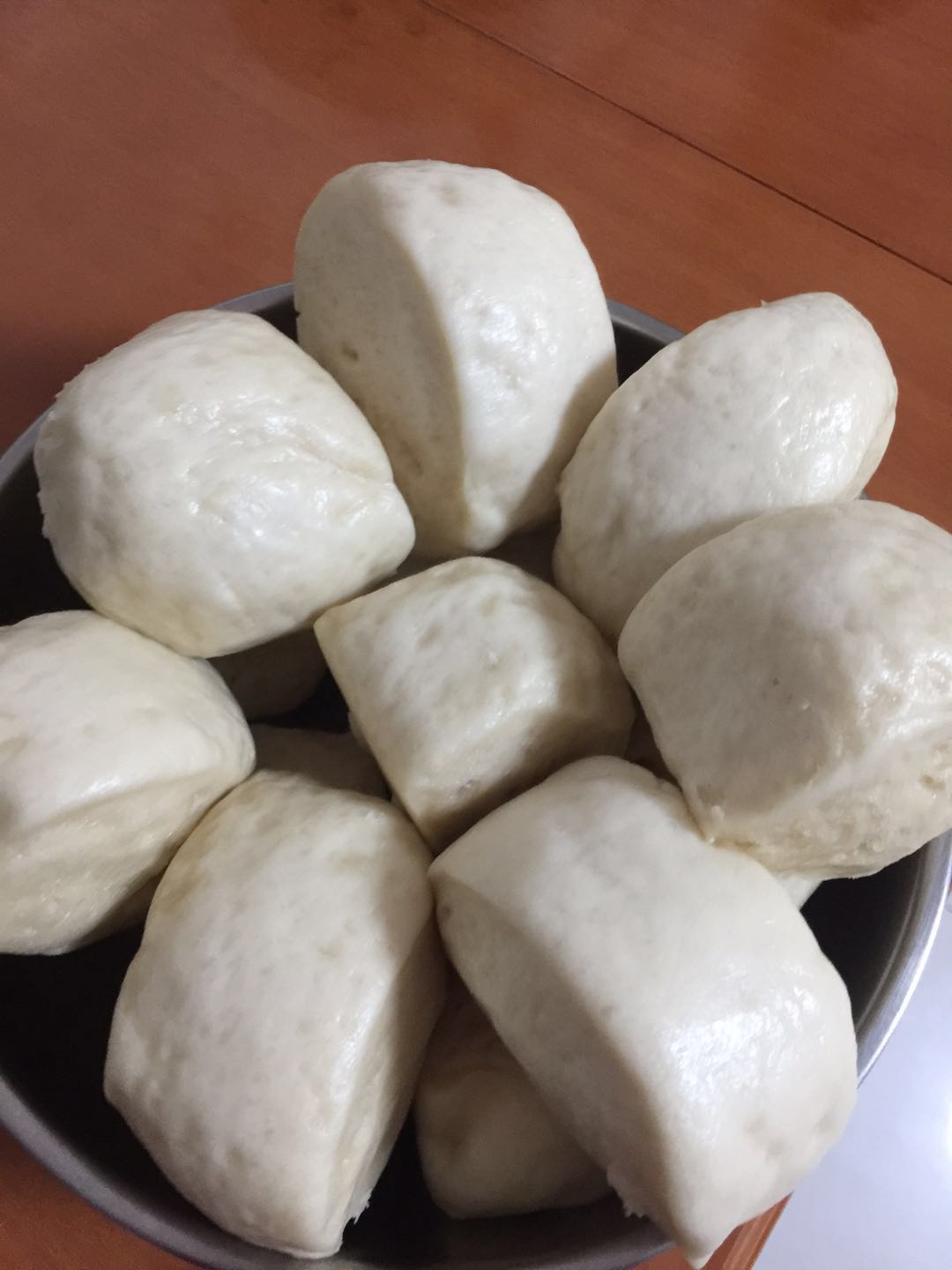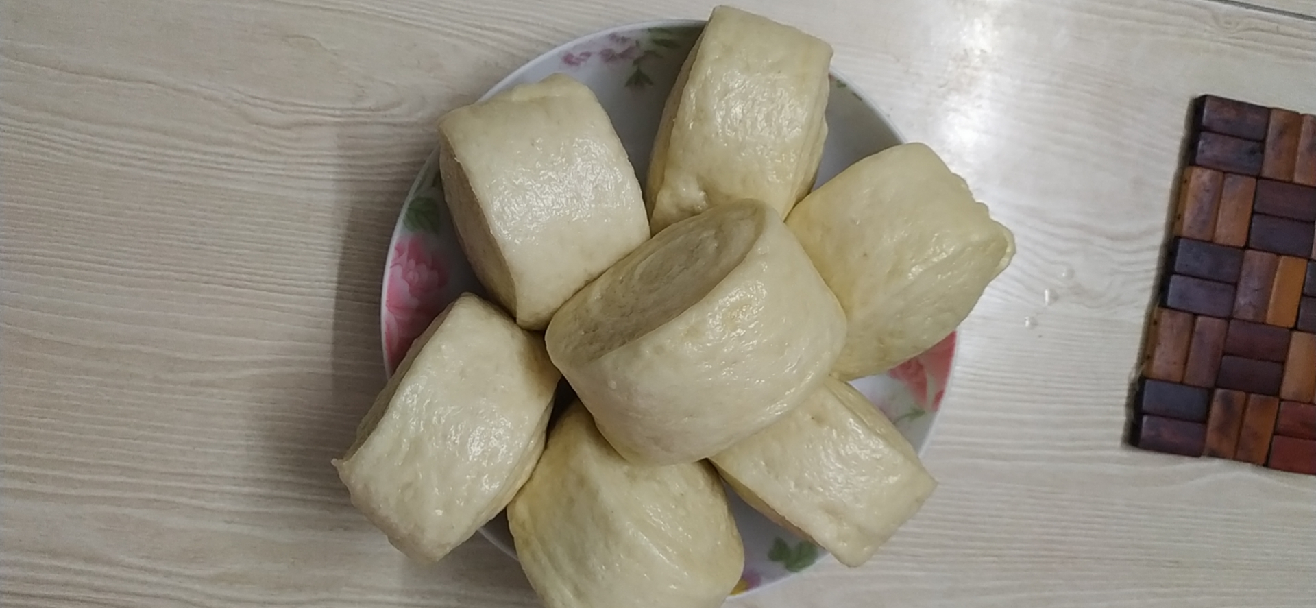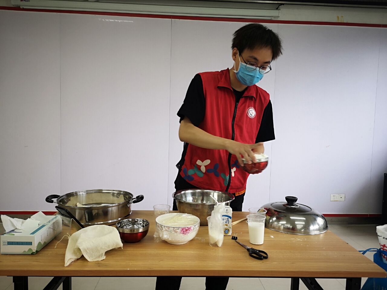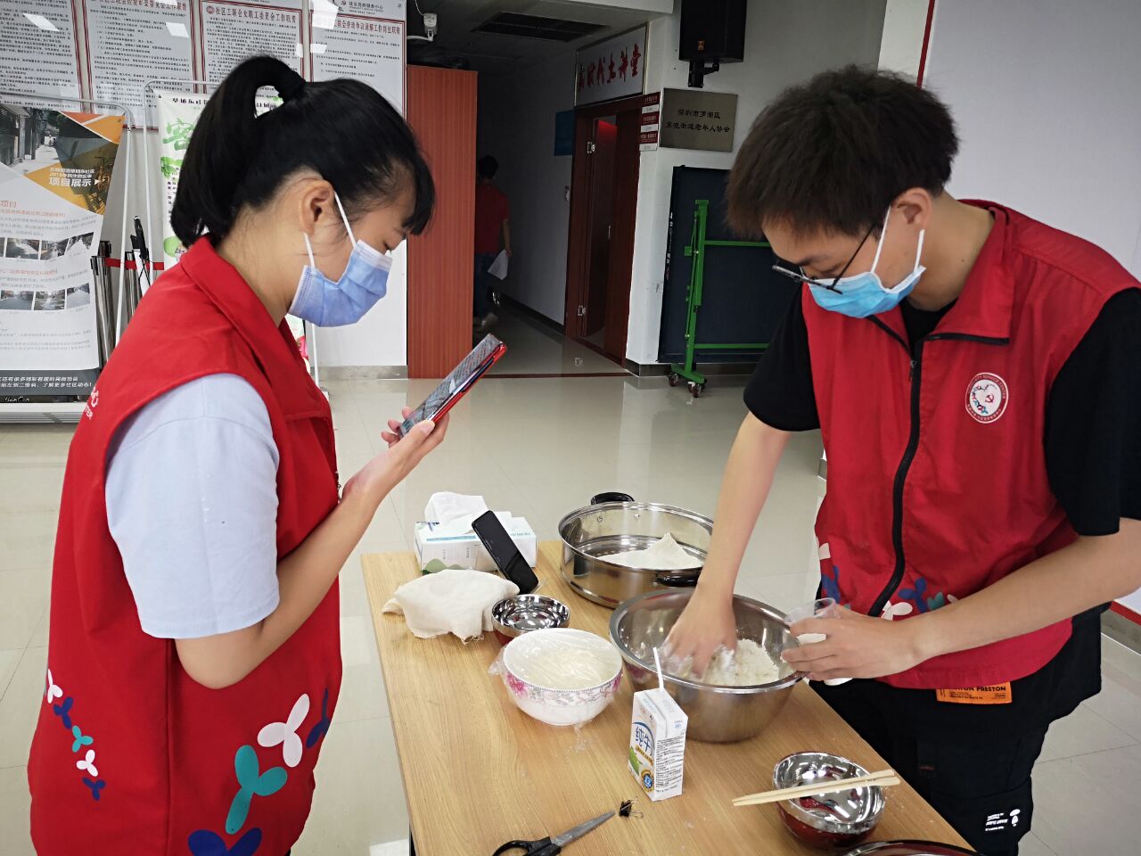 开展前,参加者线下无接触领取奶香馒头的材料。工作坊开展当天,社工开始线上直播将奶香馒头的制作材料及过程给大家讲解和演示。社工先将酵母粉用温水搅拌倒入牛奶中,然后将混合好的液体慢慢倒入面粉中,面粉揉至光滑的圆球,接着用保鲜膜封好等待发酵2小时,由于时间关系,社工将预先发酵好至两倍大小的面团拿出来,将面团继续揉搓,将面团内的气体排出,面团变得光滑后揉成长条状后用刀切成块状,最后将块状的面团放入蒸锅中继续等待二次发酵约半个小时,冷水下锅蒸15分钟左右即可,蒸好后等待几分钟再开锅。过程中与直播间的参加者一起进行弹幕互动,社工也耐心地回答大家的问题。直播结束后,参加者们纷纷开始尝试制作奶香馒头,做好后,大家把做好的馒头照片发到微信群里和大家一同分享,大家品尝了自己的作品后都觉得味道不错,获得了满满的成就感。