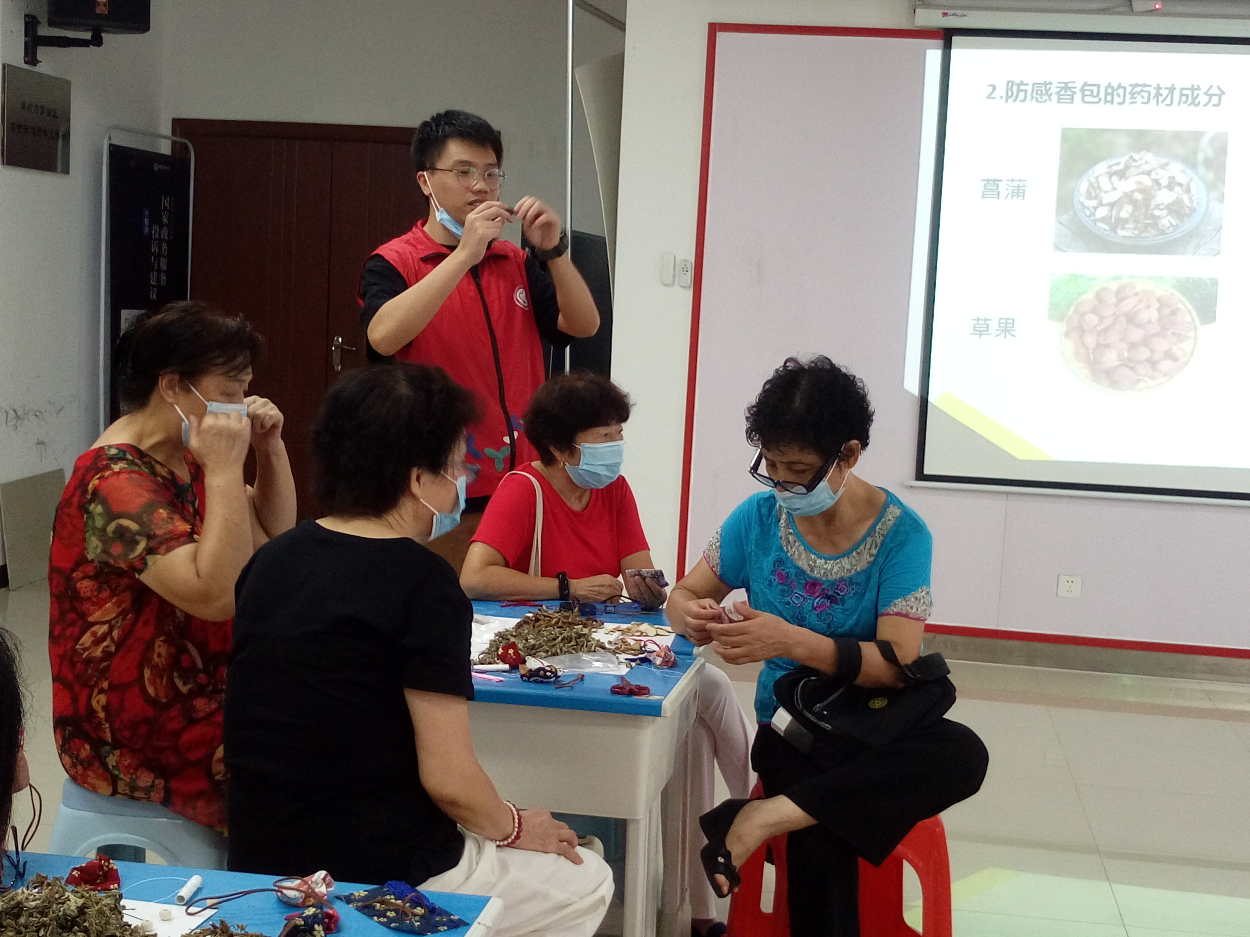 本次工作坊在草埔东社区活动室上午10点准时开始,共有19名社区长者参加。工作坊分为两个环节,第一个环节是由陈伟锋社工作讲师,向社区长者科普防感香包的知识,包括防感香包的作用、药理机制、使用方法和药材成分。第二个环节则由温丹瑶社工来带领,一步步地教授社区长者如何手工制作防感香包。在两个环节下来,社区长者清楚地了解到了防感香包的知识,并一针一线用心制作出了属于自己的防感香包。