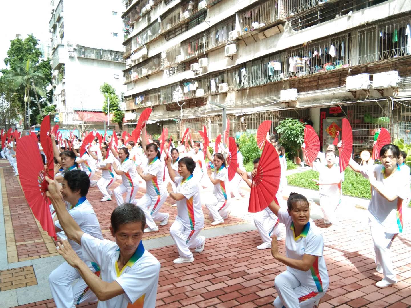 放眼望去,社区广场,一看!红色的功夫扇时而像一群群翩翩起舞的蝴蝶,时而像一把把自由穿梭的利剑;一听!功夫扇时而发出微风般的呼呼声,时而发出清脆的啪啪声,真是刚柔并济。整个展演过程中队员们个个精神抖擞,功夫扇在他们的手中运用自如,充分展现出阳光健康的良好风貌。他们精彩的表演,赢得了现场观众的阵阵掌声。