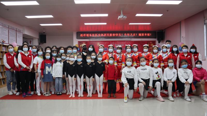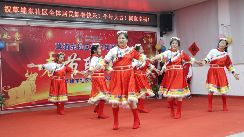 活动伊始,一首《欢乐吉祥》的歌曲响起,藏族舞蹈映入眼帘,让大家马上沉浸在过年的氛围中;接着是一群小朋友们的中国舞展示,整齐划一且优美的动作,让大家看到了未来花朵的力量;一首《天路》的宏伟演唱,让人联想到国家在基础建设取得的伟大成就,同时也感受到了歌唱家的专业演绎;一群群小朋友充满活动的舞蹈、啦啦操、健身球展演,呈现出大家健康向上的精神面貌;沉稳流利的《弟子规》朗诵,令观众们忍不住为7岁的表演者点赞打CALL;最后节目是全体社工合唱《相亲相爱一家人》,让大家感受到草埔东社区大家庭的温情。