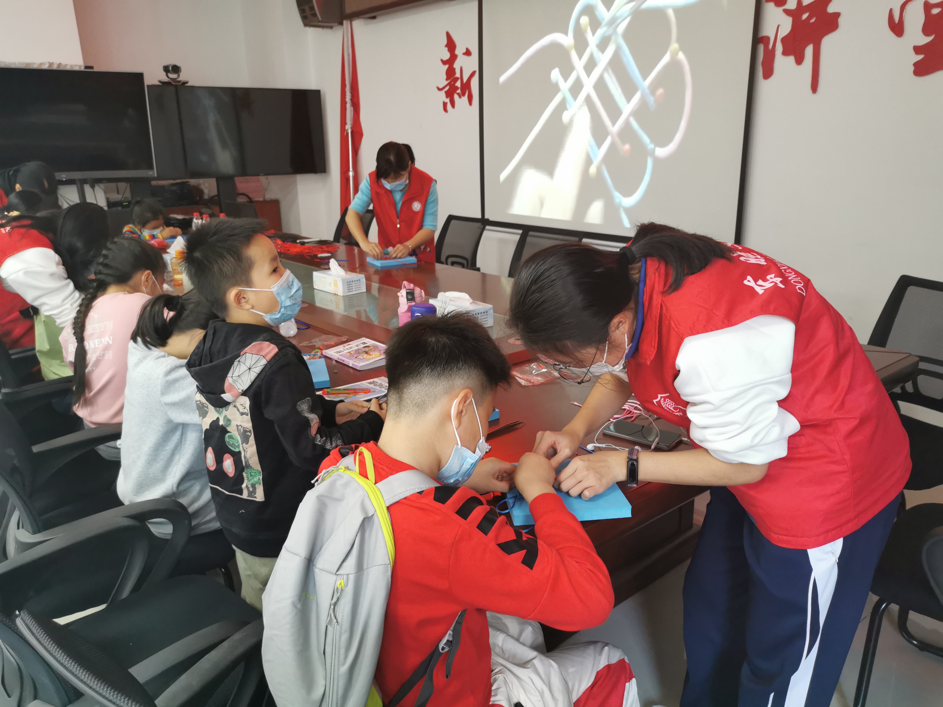 活动现场,分为中国结的介绍、中国结制作学习和作品展示三个环节。首先,黄社工着重介绍开展传承指尖非遗文化的重要意义,给大家展示精致而漂亮的中国结;接着播放中国结制作视频教程,社工及义工也同步进行教授,展示中国结制作的整个步骤和流程。