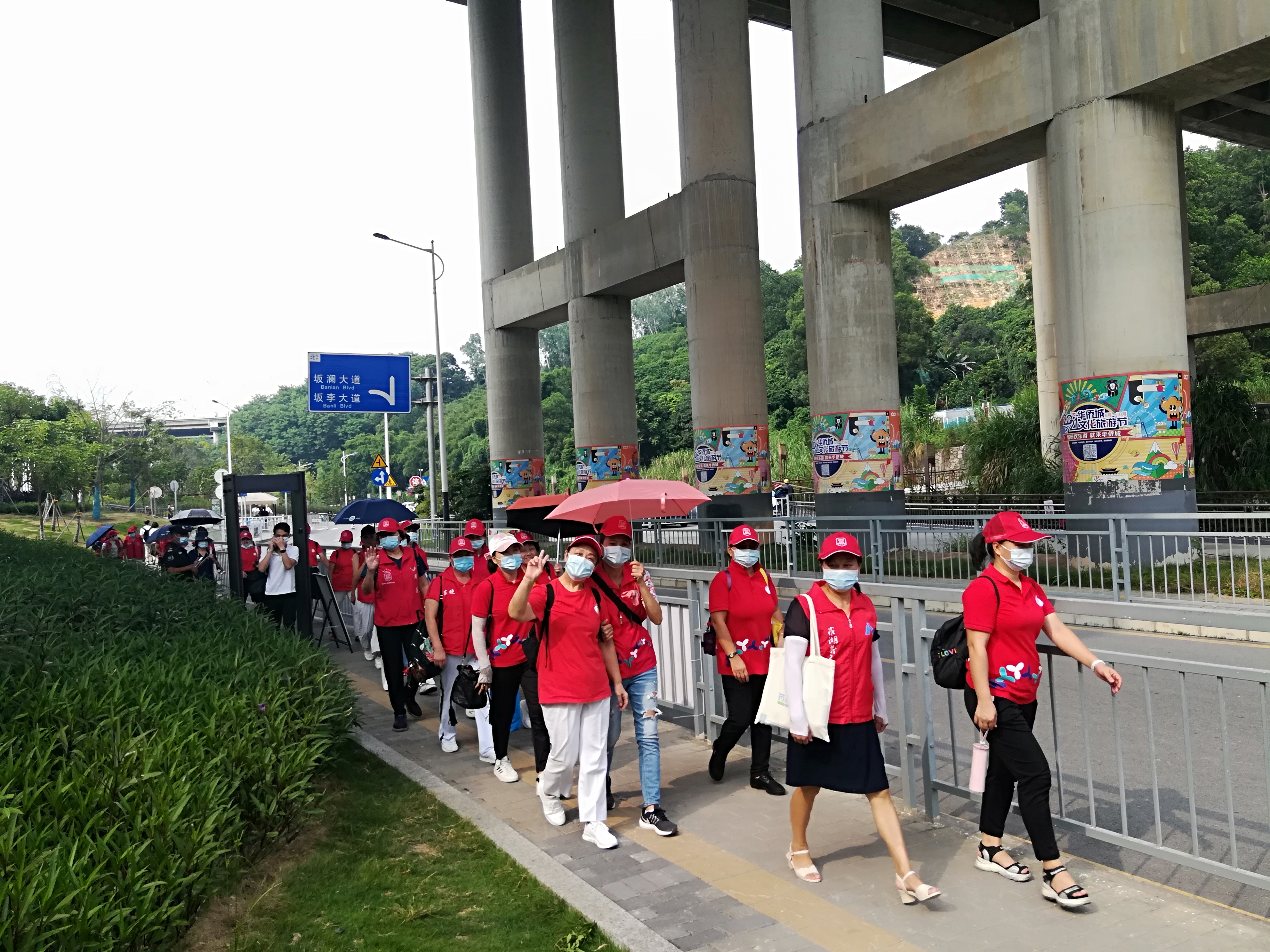 在出发团建路途中,大家都被公路两旁插满鲜红的国旗所吸引,听着唱着爱国歌曲,大家纷纷赞叹着祖国的强大和美好。在行走的路上,义工身穿着红色的义工服,走着坚定的步伐,展现着我国群众居民的积极风貌。