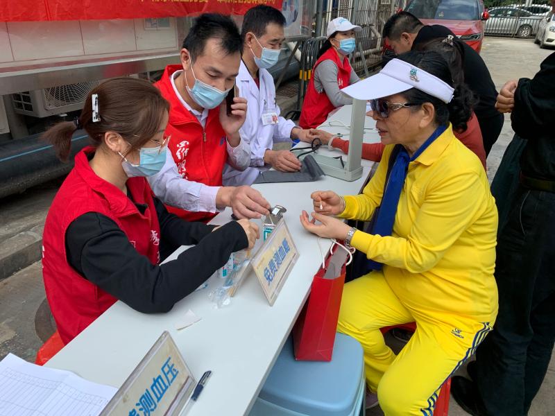惠民便利,公益义诊。为了方便社区长者的参与,深圳市仁康医院的医师来到社区紫荆花园A栋1楼设置了摊位。在摊位里,医师为前来参加义诊活动的社区长者进行免费血糖和血压检测,以及现场提供相关的中医问诊,帮助长者居民清楚自己身体的状况,进行合适的生活作息调整。