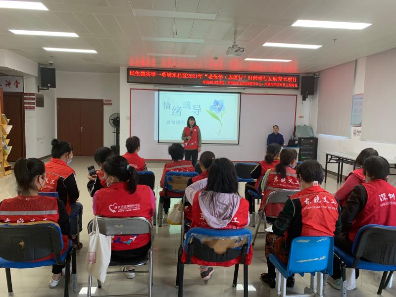 东晓街道草埔东社区自开展学习党史活动以来,深入进行了解社区居民各个群体的需求,草埔东社区党委认识到社区高龄长者的情绪压力以及社区义工服务时遇到的困境,为此在草埔东社区党委联合深圳市东西方社工服务社,于11月10日下午组织开展草埔东社区“老伙伴·志愿行”情绪疏导技能提升培训,义工通过掌握情绪疏导的技巧和方法,从而更加适切地服务社区高龄长者。