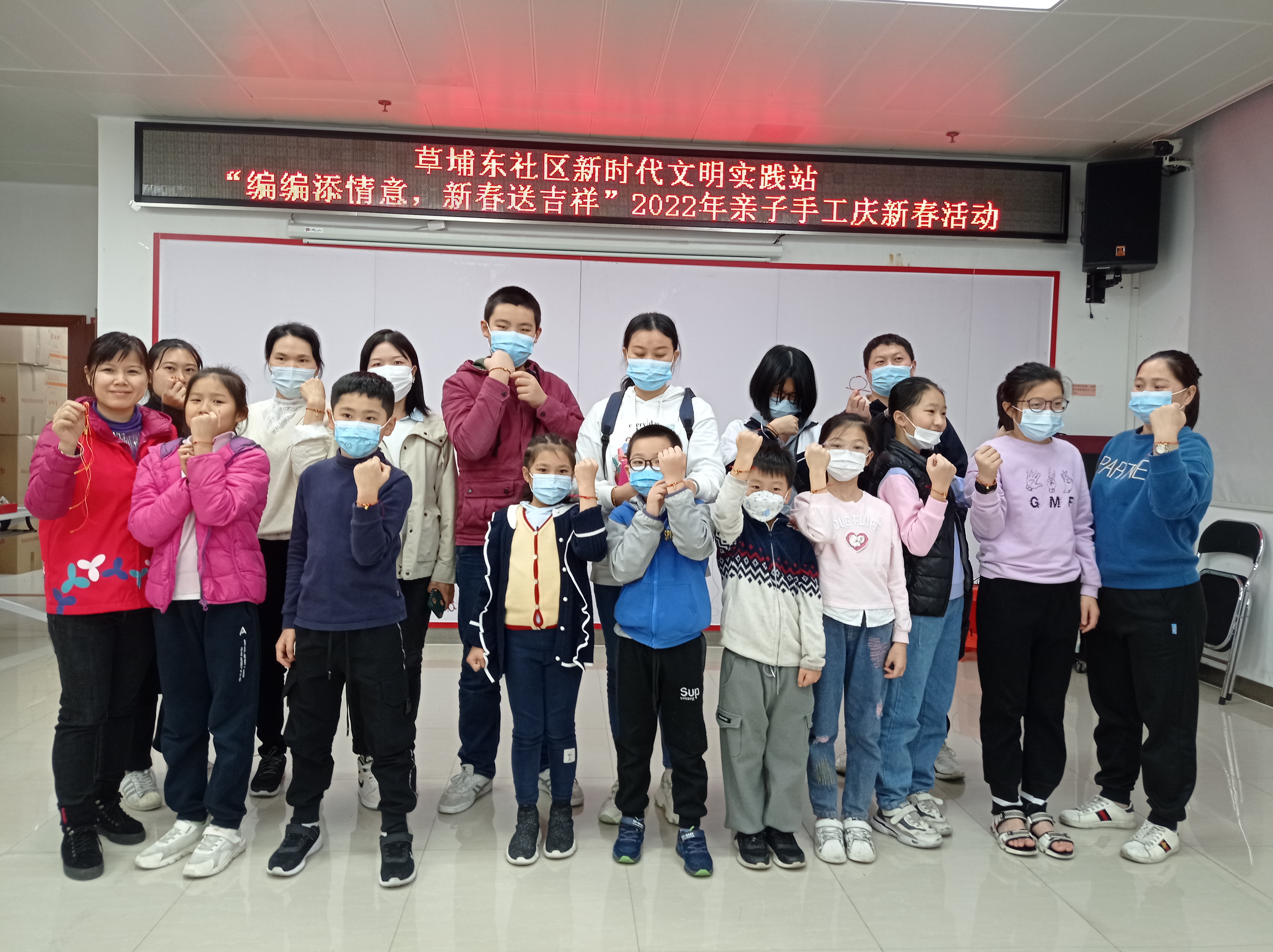 在新春佳节之际,为了让社区居民有更多的归属感、幸福感,度过一个温暖祥和的佳节,2月6日,草埔东社区新时代文明实践站开展了“编编添情意,新春送吉祥”2022年亲子手工庆新春活动,活动吸引社区10对亲子家庭参加。