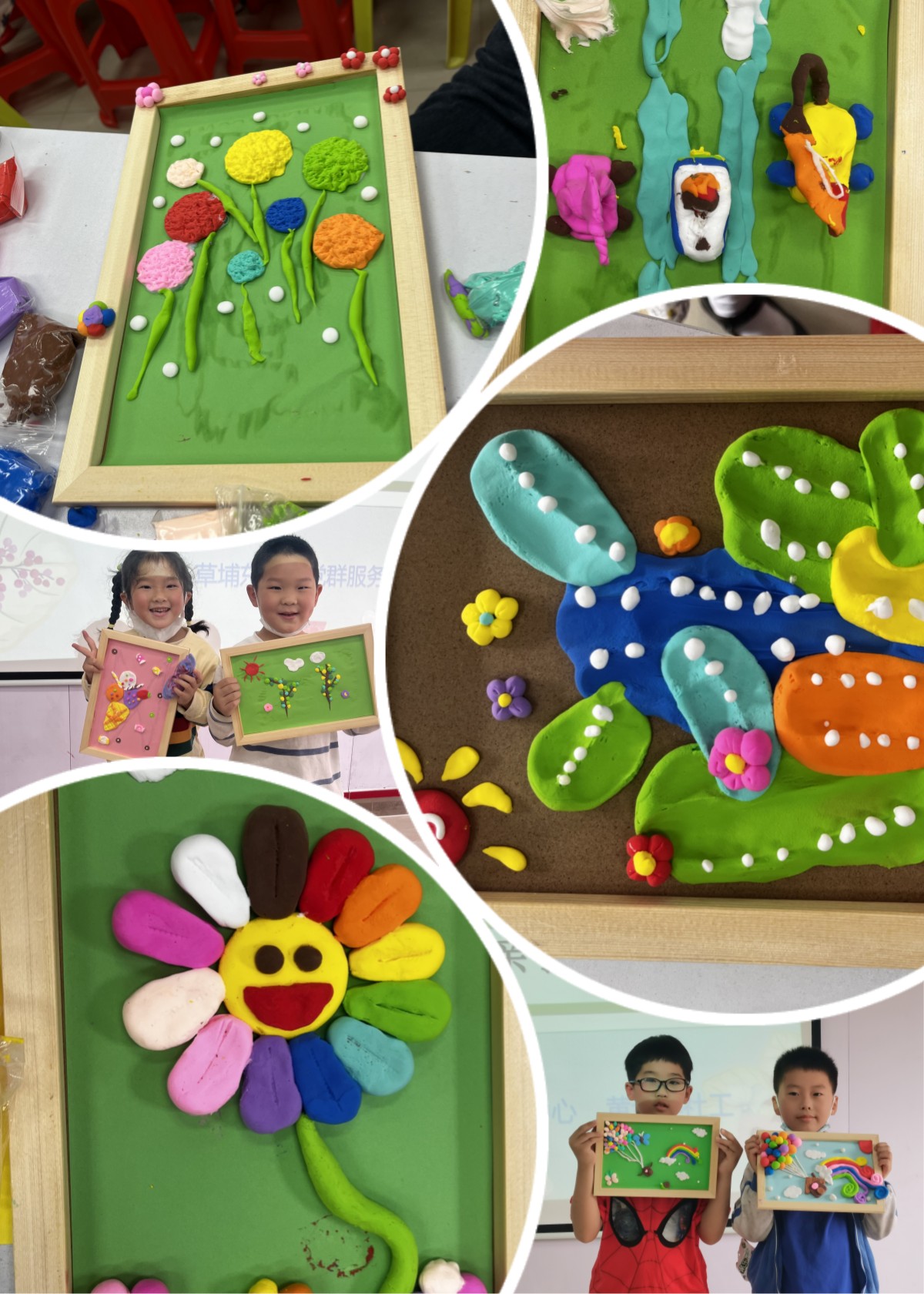 活动过程中孩子们像一个个小画家,家长们也在旁边不时地针对构图、色彩等方面给孩子们提出一些小建议。有的家庭运用可爱的卡通图案进行装饰,有的做了符合春天的花朵画框,有的做了诱人的美食荟萃。一幅幅缤纷多彩、各具特色的手工黏土画在孩子们和家长的手下诞生。各种各样、丰富多彩的黏土画如同孩子们充满童真的内心世界,单纯而绚丽。大家一边互相欣赏作品,一边聊天,家长和孩子们都认识了不少新朋友。欢声笑语中,活动落下帷幕,大家捧起自己的得意之作拍下大合照,定格美好瞬间。