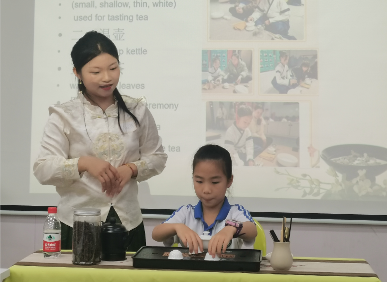 最后,奉茶礼环节,孩子们双手执杯,鞠躬行礼,对妈妈(爸爸)说一声:“辛苦了”。茶艺文化延承了中华民族传统礼仪的孝道,让孝道常存于我们心中。