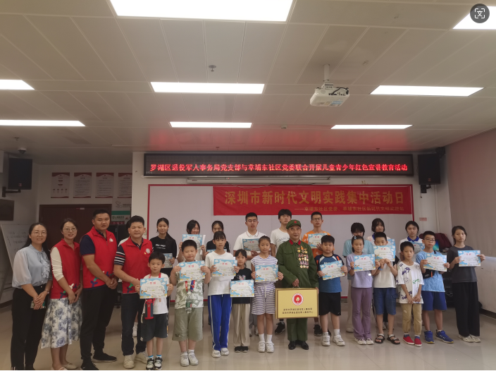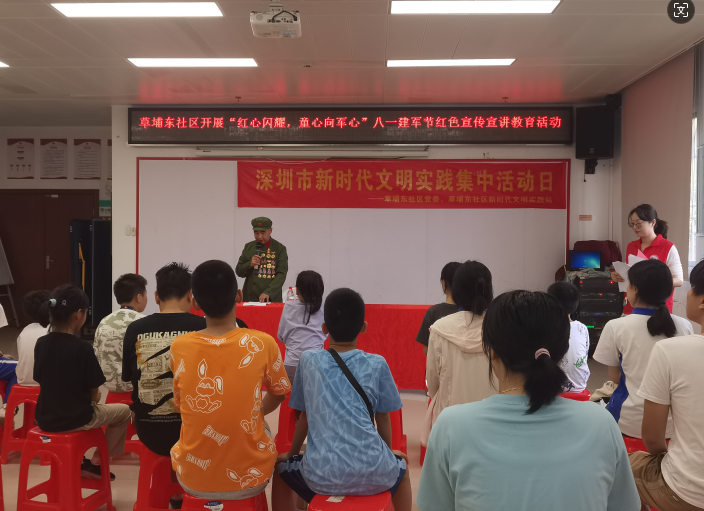 为了引导儿童青少年树立正确的价值观和世界观,让儿童青少年在历史中汲取力量,激发其进取心和创新精神,成为中华民族伟大复兴的建设者和接班人。罗湖区退役军人事务局党支部与草埔东社区党委联合开展“红星闪耀,童心向军心”八一建军节红色宣传宣讲教育活动。
