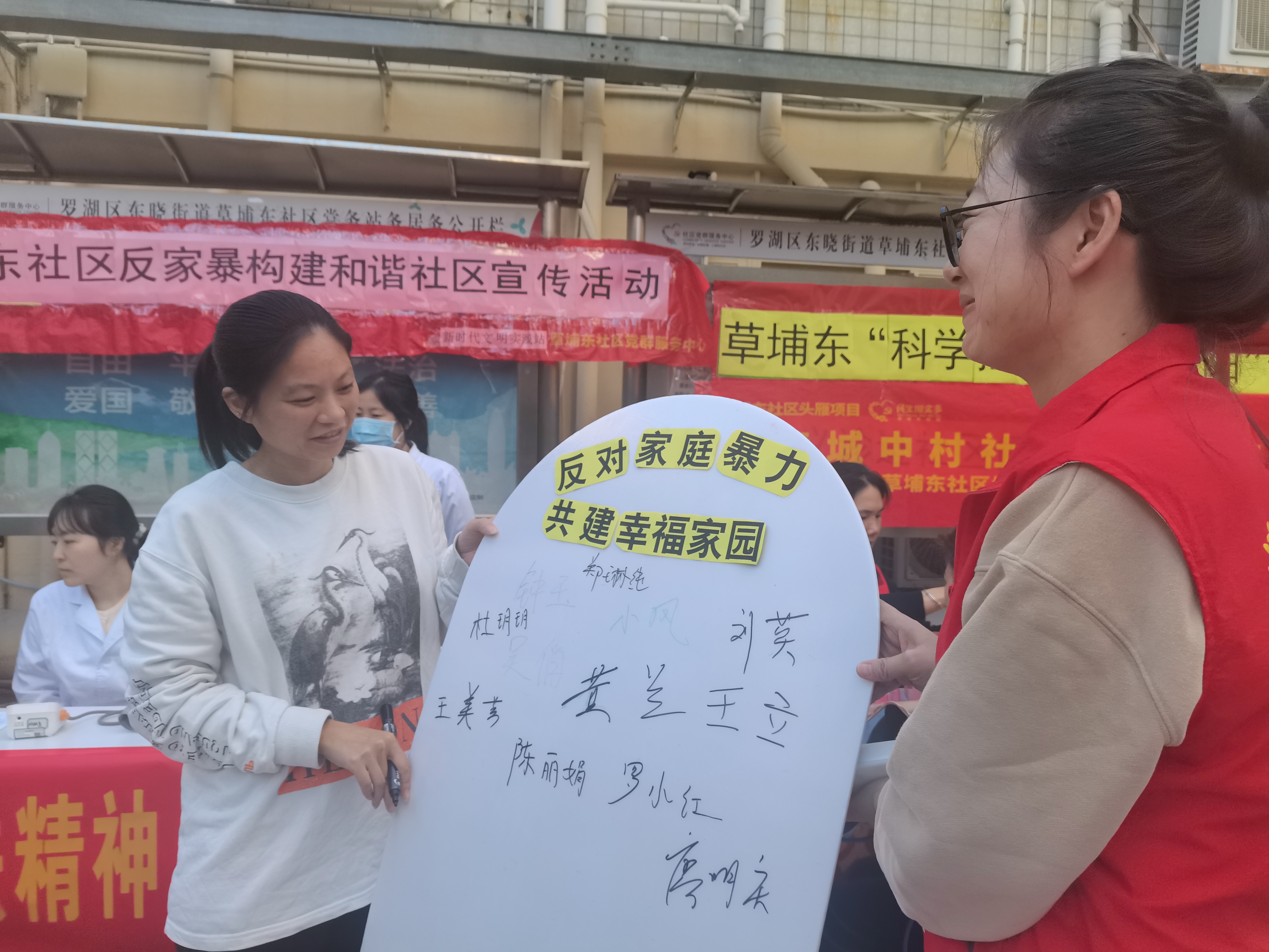 为增强弱势群体对家庭暴力行为的防范意识和能力,社区工作人员发动现场居民在“反对家庭暴力,共建幸福家园”宣传板上进行反家暴承诺签字,提高居民群众对反家暴的关注度和责任意识,学会运用法律武器维护自身合法权益。此外,社区工作人员在“惠民宣传”摊位为辖区居民、职工、“两新”群体等劳动群体讲解工会权益保障相关政策;开展垃圾分类知识宣传,倡导居民群众积极参与垃圾分类,共同营造绿色宜居环境;并进行消防安全、应急知识、反诈骗、“扫黄打非”、扫黑除恶等平安建设主题宣讲,积极营造良好法治氛围,切实增强群众法治观念。