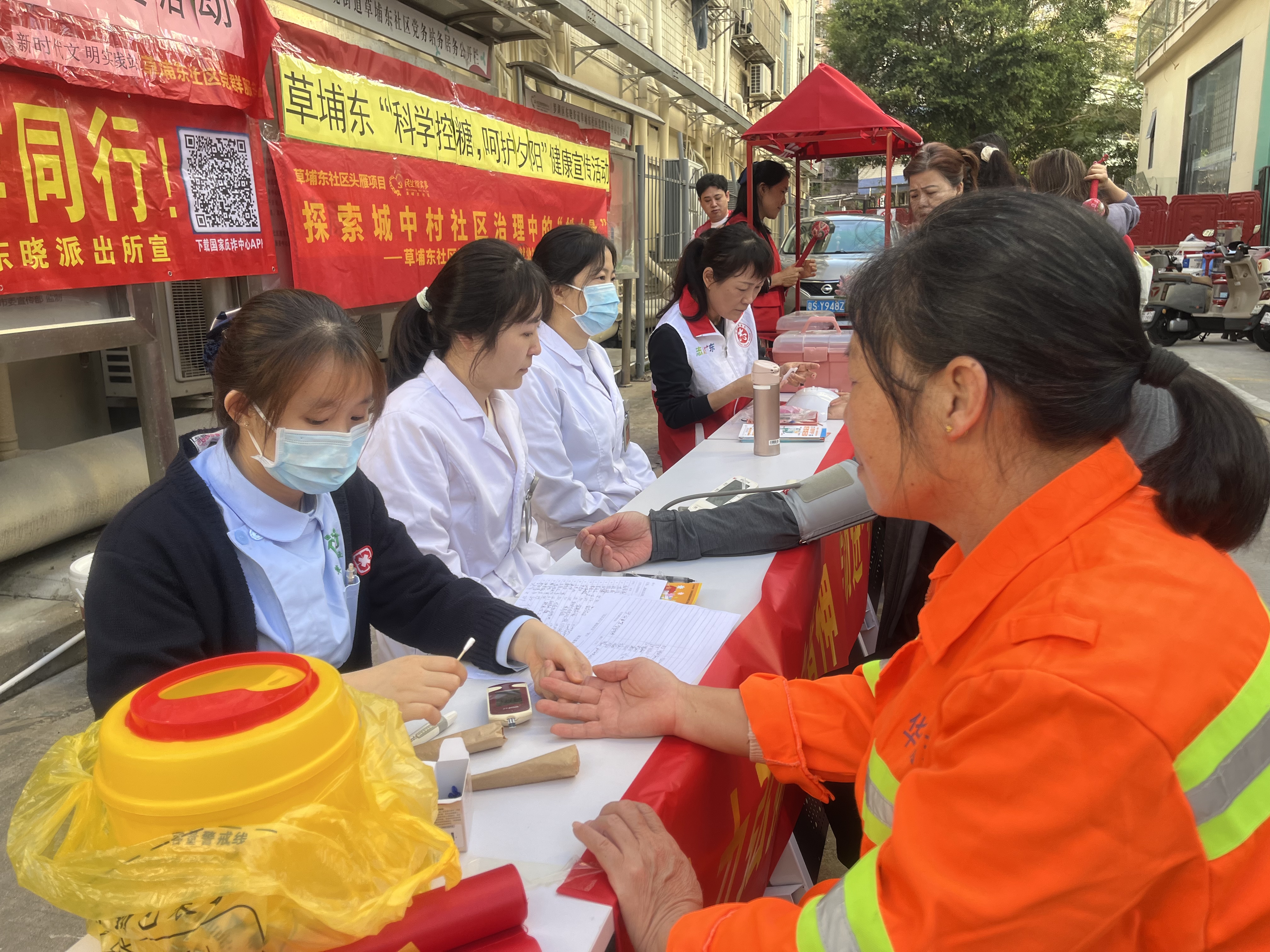 在“义诊”服务摊位,医护人员为辖区居民群众提供血压和血糖测量服务,细心询问他们的身体状况和病史,耐心解答他们提出的各种问题,并设置了健康咨询台,为居民群众提供一对一医疗咨询,给出相应的治疗建议和健康指导。医护人员还为居民群众宣传健康养生知识,增强他们的健康意识和自我保健能力。