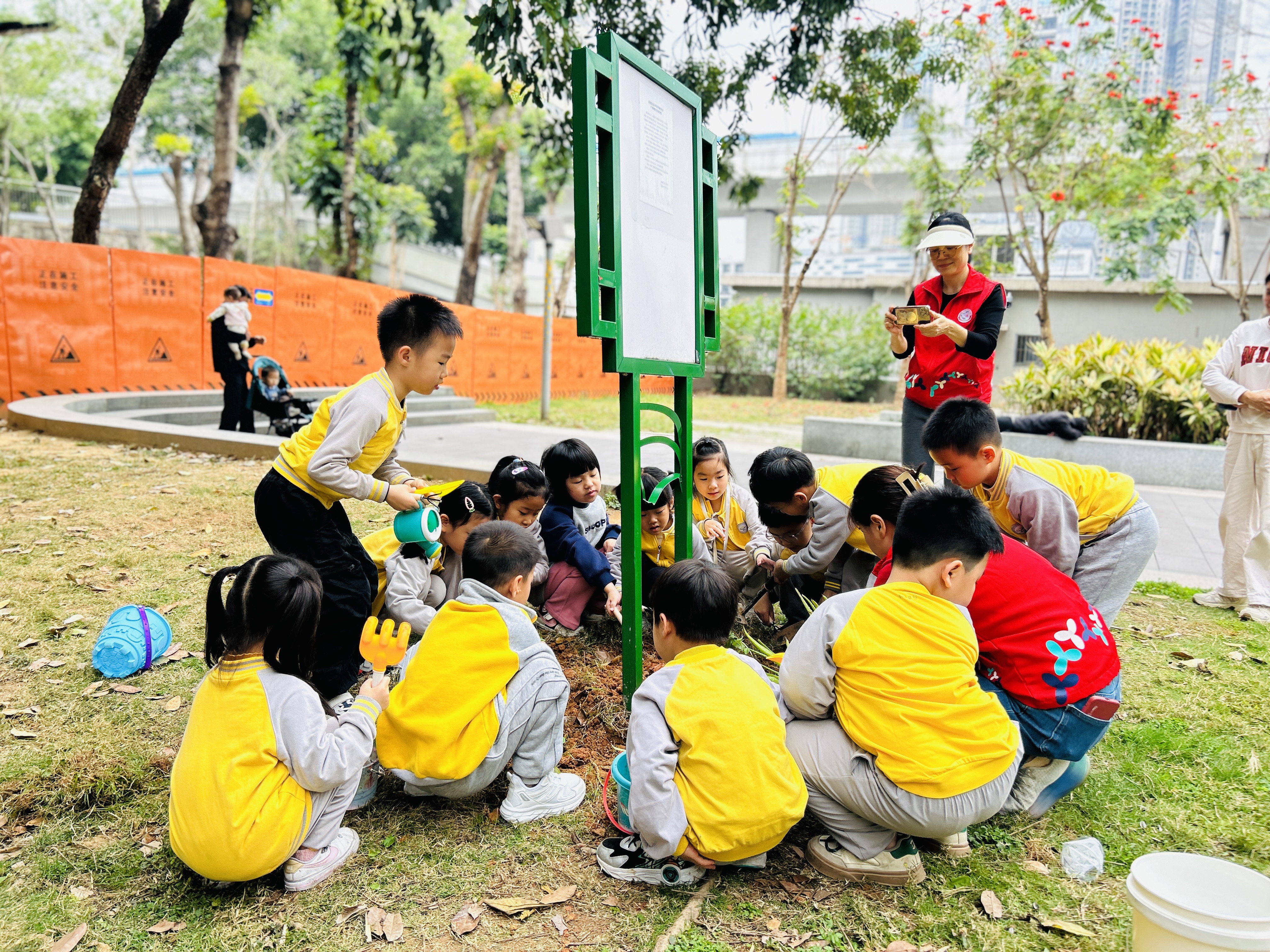孩子们在老师和社区志愿者的陪同下,兴致勃勃地来到草埔社区公园。社工准备了向日葵苗、种子及种植工具。党员教师们率先垂范,带领孩子们挖坑、培土、浇水,每一个步骤都耐心讲解,手把手指导。孩子们兴高采烈,干劲十足,有挖坑,有的用小铲子填上土,还有的提着水壶浇水,场面热闹而有序。