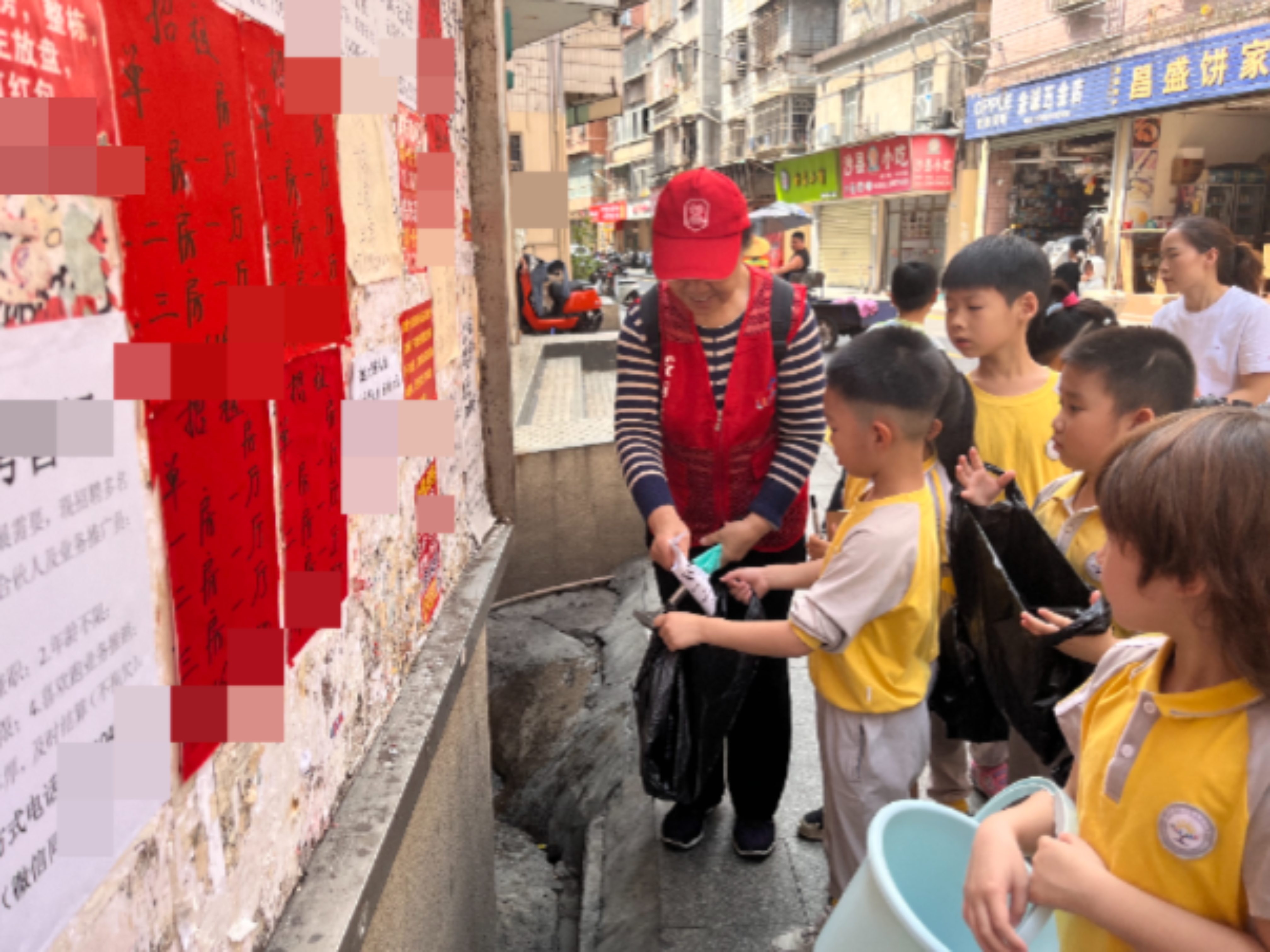 走出办公区域,小朋友们迎来了更具挑战性的任务 —— 参与草埔东社区清洁日活动。社区工作人员为小朋友们分发了垃圾夹、垃圾袋等工具,小朋友们在工作人员和志愿者的带领下,有序地在社区内开展环境卫生维护行动。他们有的手持垃圾夹,小心翼翼地夹起地上的烟头、纸屑等垃圾,放入垃圾袋中;有的勇敢地走上街头,对不文明行为进行劝导;还有的在志愿者的指导下,拿着小铲子,清理张贴栏上的小广告。在志愿者的帮助下,协助维持交通秩序。