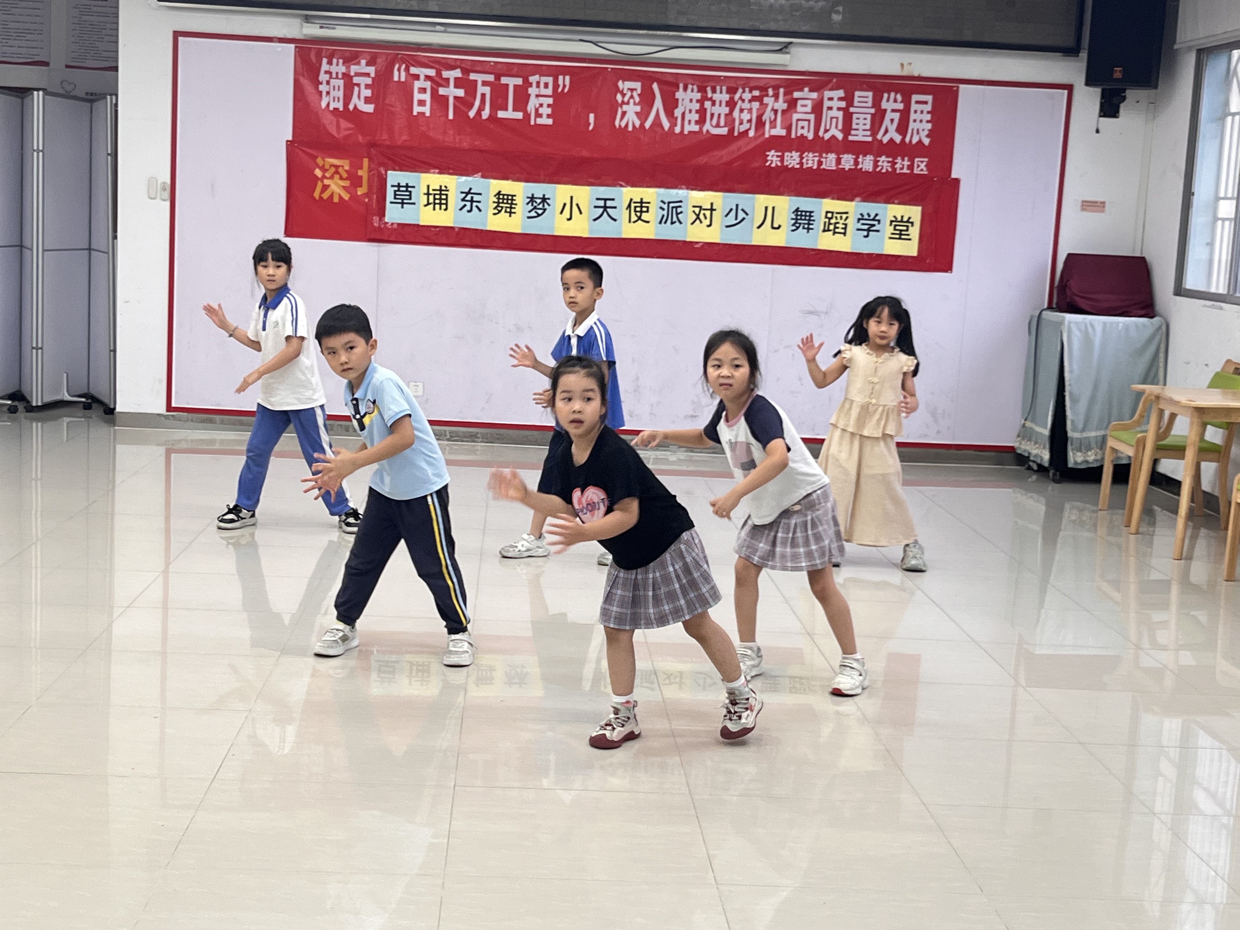在草埔东社区党委的领导下,6 月4 日下午,"舞梦小天使派对" 少儿蹈学堂在社区活动室圆满收官。这场公益舞蹈课堂历时一个月,累计开展 4 场,服务城中村社区儿童青少年 110 人次,以艺术教育助力儿童成长,成为落实 "百千万工程" 的生动实践。