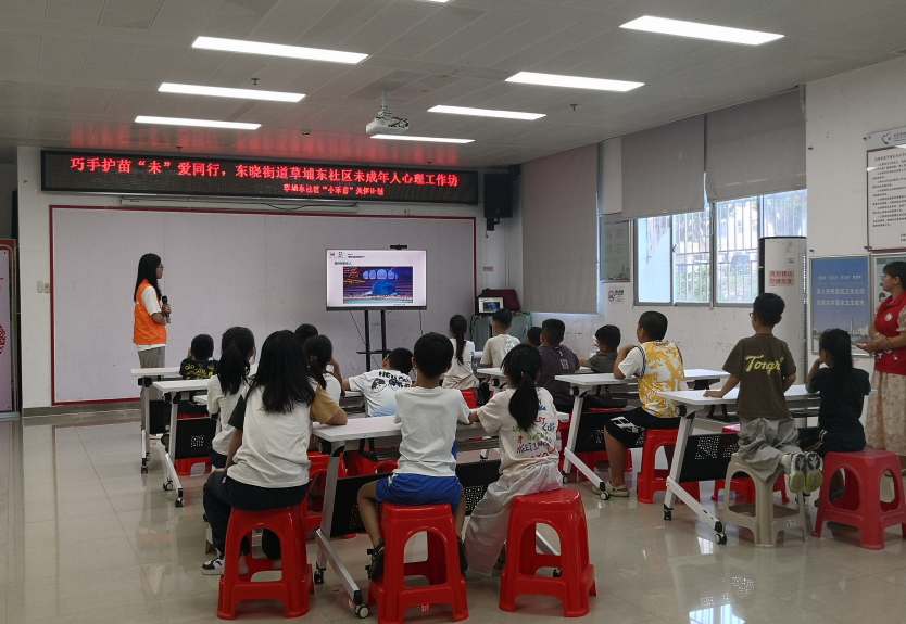 东晓街道草埔东社区“小禾苗”关怀计划之未成年人心理支持工作坊。作为社区落实“百千万工程”的重要举措,本次活动以“巧手护苗・'未'爱同行”为主题,通过社工引导与趣味手工相结合的方式,吸引20余名儿童青少年参与,为社区青少年提供全方位的成长支持。