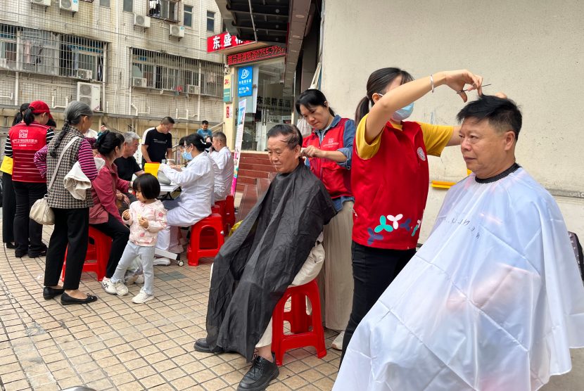 除了专业的健康义诊,活动现场的“爱心义剪”服务也同样深受欢迎。义剪区的志愿者们技艺娴熟、服务热情,伴随着细碎的剪刀声,长者们片刻间便拥有了清爽利落的新发型,脸上洋溢着幸福的笑容。许多长者表示,不仅检查了身体,还理了发,整个人都精神了,这份“重阳礼”非常贴心。