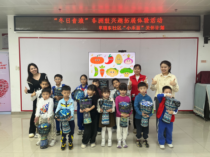 罗湖家园网讯:2025年12月12日,草埔东社区“小禾苗”关怀计划之“冬日音浪”非洲鼓兴趣拓展体验活动在欢快的节奏中拉开帷幕。活动吸引14名儿童参与音乐体验,旨在帮助儿童在节拍中释放情绪、感受快乐,增强社区归属感,助力健康成长。