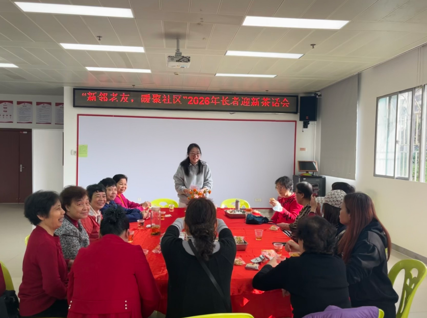 罗湖家园网讯:春临鹏城,暖意先行。2 月 4 日上午,罗湖区东晓街道草埔东社区活动中心笑语喧阗,一场以 “新邻老友,暖聚社区” 为主题的 2026 年长迎新春茶话会在此举行,15 余位社区长者围坐一堂,品热茶、话家常、玩游戏,在立春节气民俗的氛围里,解锁 “老有所乐” 的社区幸福密码。