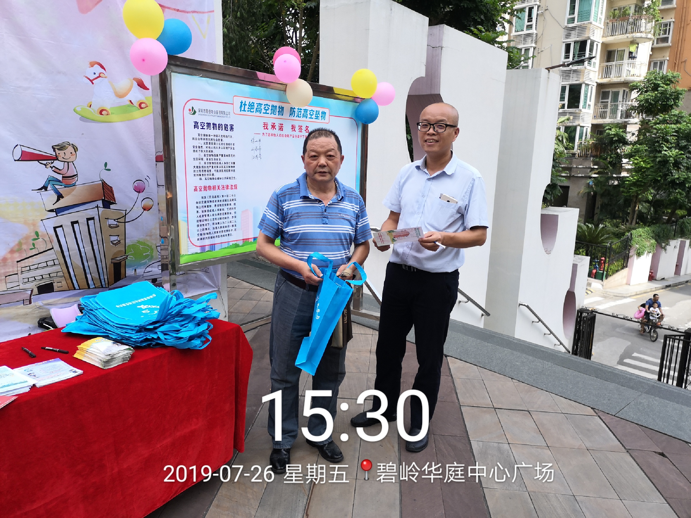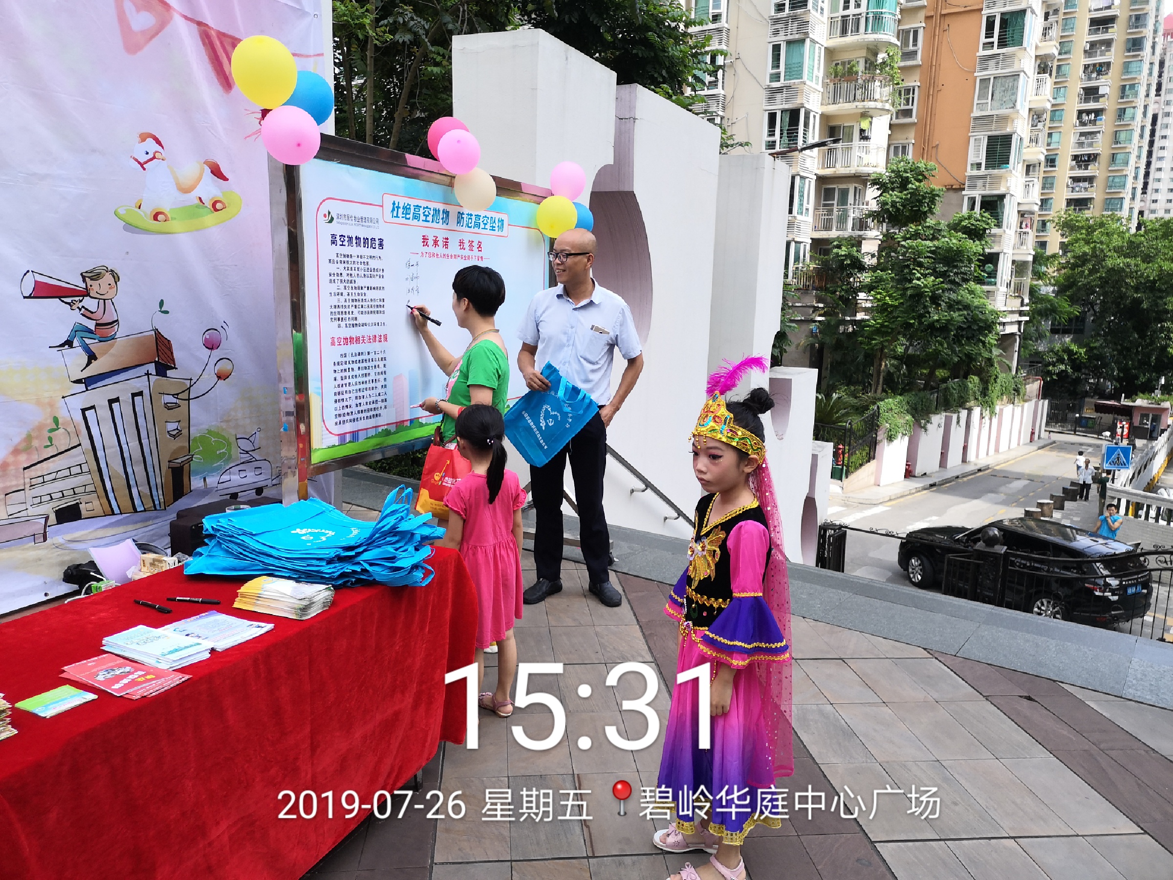 罗湖家园网讯:为了营造文明而安全的社区环境。7月26日下午,碧岭华庭管理处在碧岭华庭中心广场组织开展了“杜绝高空抛物防范高空坠物”宣传活动。