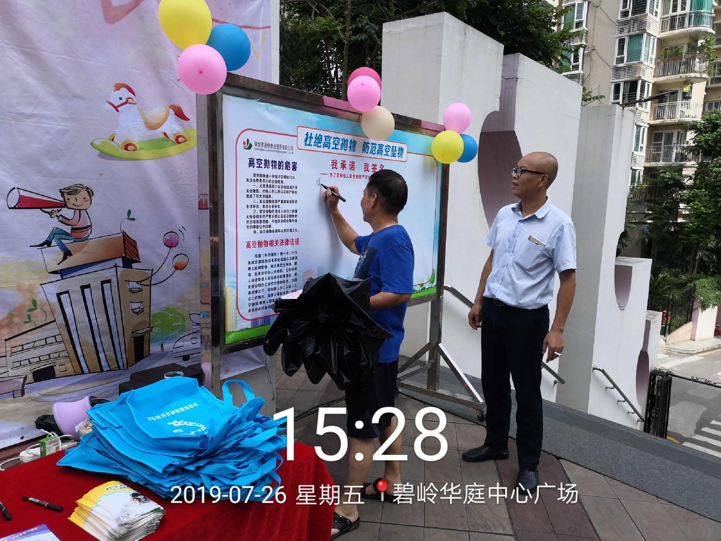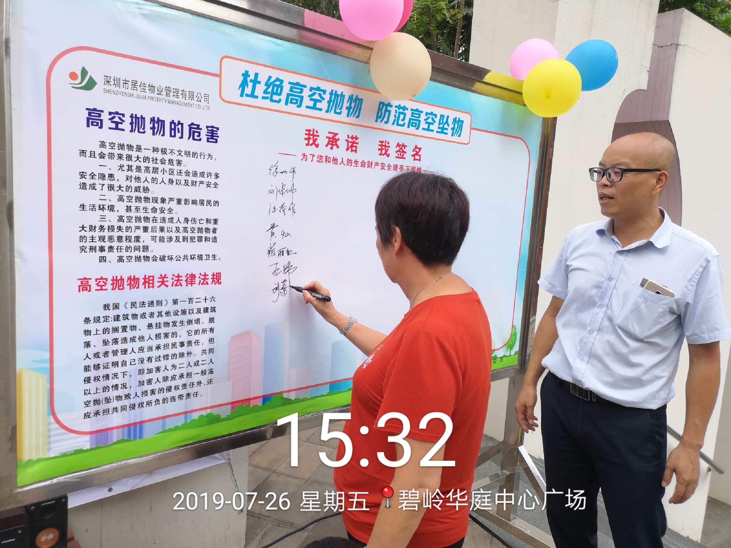 活动中,碧岭华庭管理处的工作人员以宣传台为主要阵地,通过“发放宣传单+签名宣誓”的形式进行宣传,向来往的居民以及人群比较密集的地方发放拒绝高空抛物宣传单,向居民讲述高空抛物的危害,提醒和告诫业主禁止高空抛物,倡导文明居家,共建和谐社区,从而减少和杜绝高空抛物的现象。活动一开始就受到居民群众的强烈反响,大家纷纷在杜绝高空抛物的宣传栏上签名,并表示不仅自己要严禁高空抛物,更要监督身边的人,并帮着一起宣传,大家一起维护小区的安全与文明。