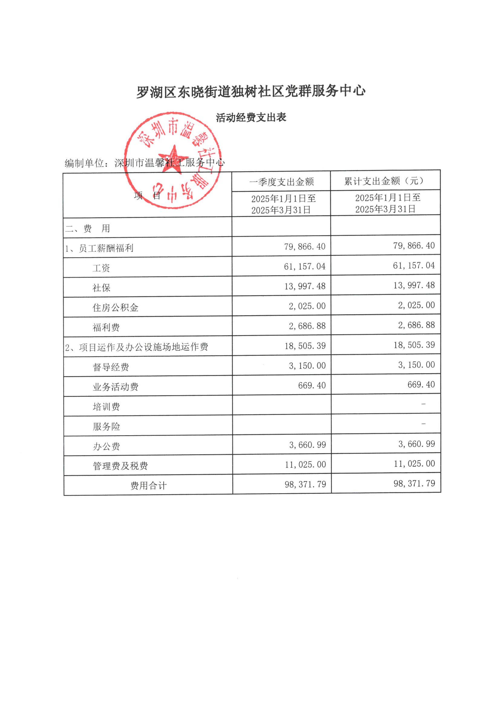 罗湖区东晓街道独树社区党群服务中心2025年第一季度活动经费支出表