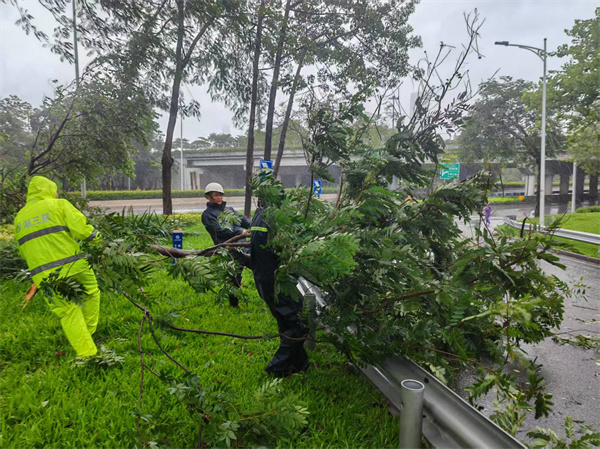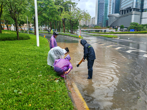 “桦加沙”台风风圈进入深圳范围内,社区工作人员全员在岗,实时监测台风动态,统筹调度应急资源;各物业单位及应急队员均严阵以待,时刻保持通讯畅通,并刷着居民消息群,守着求助电话,确保突发情况第一时间响应、第一时间处置,以“党建红”守护“家园安”,用实际行动诠释“人民至上、生命至上”的深刻内涵。社区工作人员就立即外出巡查辖区主次干道。大家兵分多路,一方面仔细检查广告牌、可移动物体是否存在危险,不放过任何一个可能因台风残留影响而存在安全隐患的角落;另一方面,着重对下水道排水口展开巡查。发现部分排水口被大量台风刮落的枝叶堵得严严实实,水流无法顺畅通过,社区应急队伍一点点地将堵塞物清理出来,对堵塞较为严重的排水口,还使用长杆等工具进行深入疏通,确保排水畅通无阻。与此同时,当巡查到布心路人行道时,社区应急队伍发现有一棵树木倒伏在路上,他们立刻展开紧急处理,熟练地操作“油锯”,大家齐心协力,及时将倒塌树木进行转移,并迅速清理道路上的残枝落叶和杂物,在发现树木倒伏到道路恢复了整洁仅用时半小时不到。