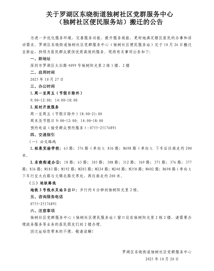 独树社区党群服务中心正在搬迁,电话网络正在迁移,待电话网络恢复正常后,将第一时间告知大家,因迁址给您带来的不便,敬请谅解。