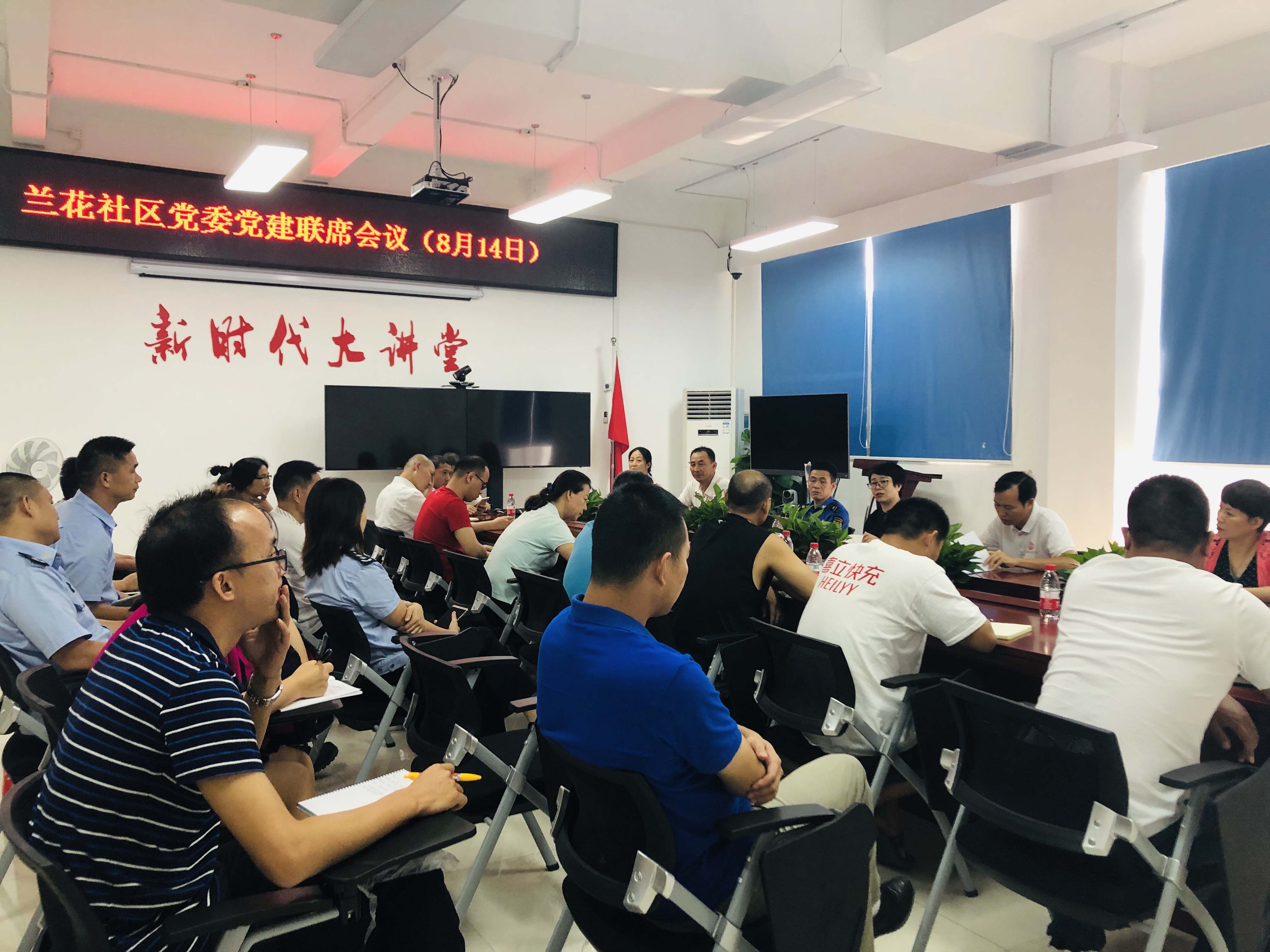 2019年8月14日下午兰花社区党委书记廖小萍在兰花社区会议室主持学习了习近平总书记在中央和国家机关党的建设工作会议上的重要讲话精神。时值“不忘初心、牢记使命”主题教育在全党扎实开展之际,会议要求各支部结合主题教育,深刻领会习近平总书记的重要讲话精神,增强“四个意识”,坚定“四个自信”,带头做到“两个维护”,推动社区党的各项建设高质量发展。