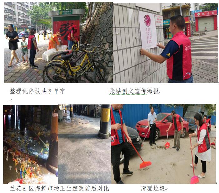 2019年8月28日兰花社区出动15人,对市场公厕(3个)、铁路沿线(华铁及海鲜市场段点2000米)及周边卫生进行巡查,督促管理处清除海鲜外张贴20多处,清扫卫生死角300平方。社区每天固定组织市容巡察员2名对布吉路沿线随意停放共享单车进行规整,组织3名义工从8点起在草埔公交站、布吉农贸市场公交站进行疏导。