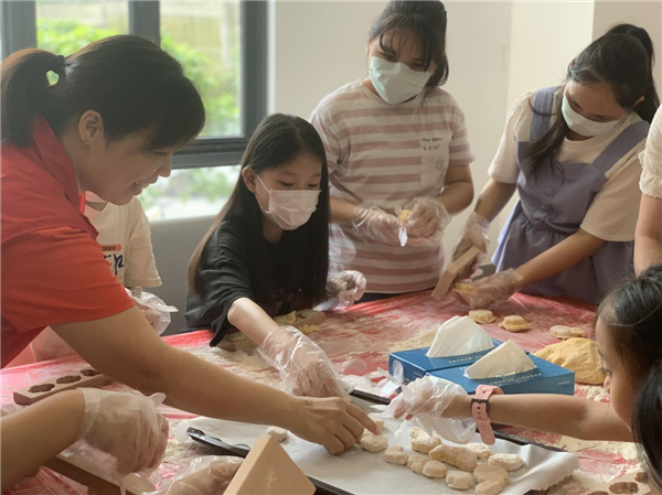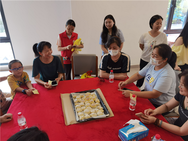活动开始,社工为大家介绍了七夕节的由来以及各地七夕节的传统民俗,随后带领大家亲手制作七夕传统食物——七夕巧果,工作人员将事先调制发酵的面团以及其他材料放置桌面,大家将发酵好的面团搓揉后切成小面剂,再塞进巧果模具进行造型,很快一个个形状各异的精美巧果便摆满了桌面,将做好的巧果放进烤箱,很快便传出了阵阵巧果的香味。