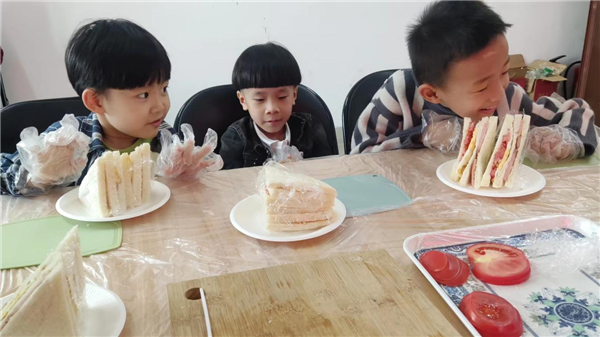 接下来煎鸡蛋、煎火腿三明治的制作也紧锣密鼓地操作起来,面包、沙拉酱、鸡蛋、火腿、蔬菜一层层地叠加,在大家相互协作,互相夸赞中,美味营养的三明治也新鲜出炉。捧着香甜的奶茶,吃着可口的三明治,分享着厨艺劳动的心得和制作经验,大家的脸上洋溢着甜蜜的笑容。小李同学表示,“我要把今天学的奶茶和面包做给爸爸妈妈尝尝,让他们看看我的能力。”小陈同学则开心表示,“今天能把自己的厨艺,展现分享给其他小朋友,感到很自豪、很幸福。”社工也借着暖暖的奶茶预祝小朋友期末考试都取得优异成绩。