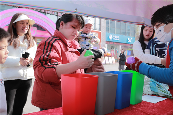 “这个是有害垃圾”“不对不对,这个应该投进可回收垃圾桶里面”……垃圾分类互动游戏也成了热门摊位,居民在轻松愉快的氛围中将不同种类的垃圾投放到相应的垃圾桶中,大家边玩边学,在欢声笑语中快速掌握垃圾分类知识。
