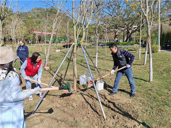 东晓街道党工委委员、综合行政执法办公室主任孙满元、绿景社区党委书记李静参加翠湖文体公园植树活动。